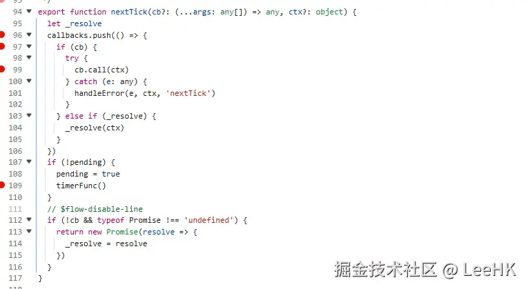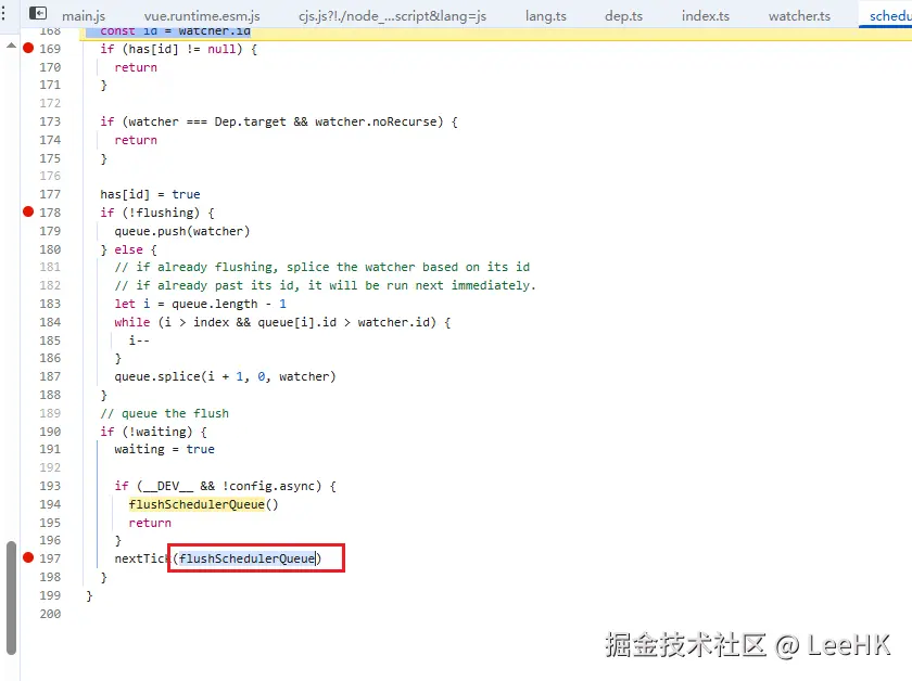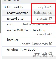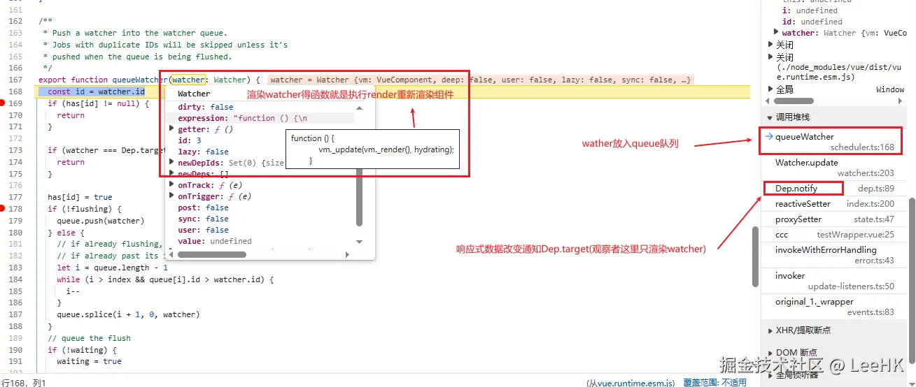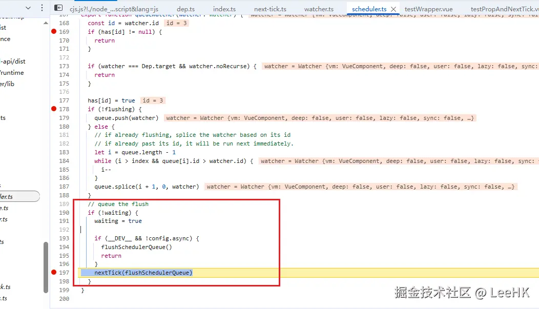 之后在断点调试得时候就可以看到调用栈上得vue源码了,都是编译前得ts文件,我们就可以分析项目中代码运行watch和nextTick得真实执行流程了