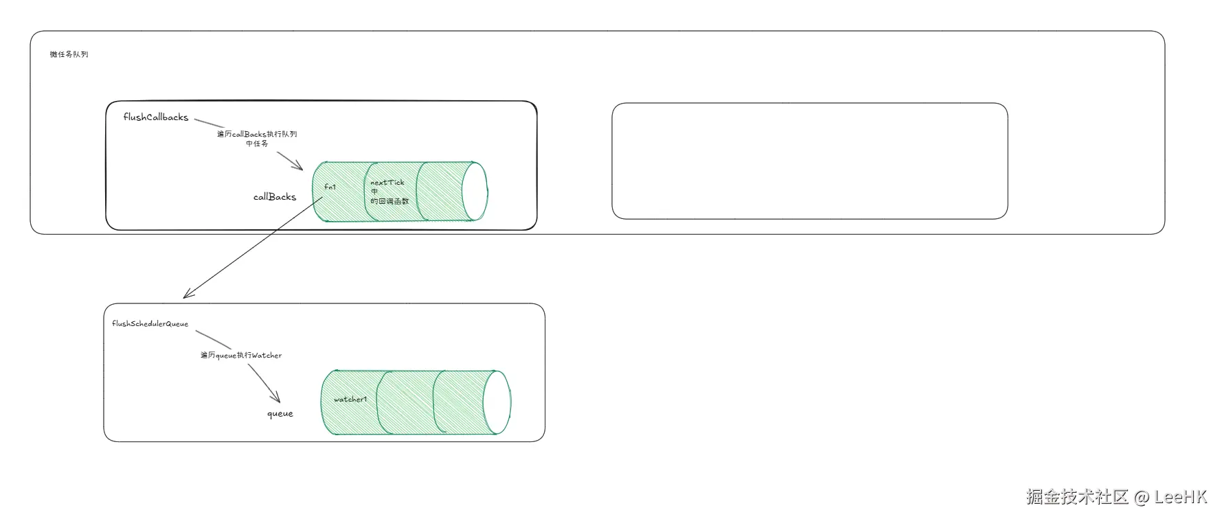 在调试完毕之后我发现我之前存在得问题: watch 本身不会创建微任务,它只是把 watcher 放入 queue 队列,如果在nextTick之后有watcher被放入队列,那么这个watcher得执行并不一定会在nextTick得回调之后,具体要看flushSchedulerQueue在callbacks中得顺序