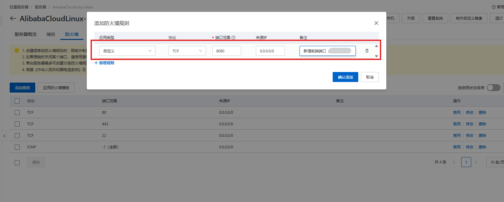在阿里云服务器的防火墙中开放 8080 端口,这样外部才能通过服务器IP:8080访问新部署的前端项目。