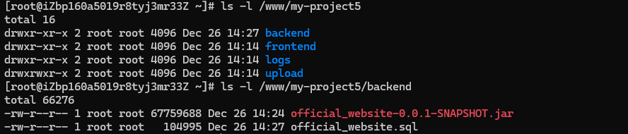 - 前端文件需先打包(npm run build),再将dist目录下的所有文件上传到/www/my-project5/frontend;