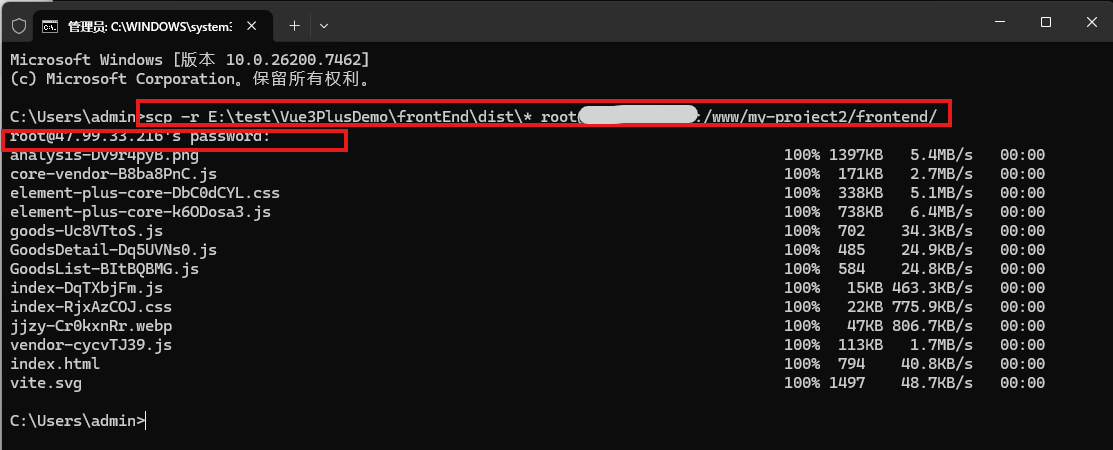 scp -r E:\test\Vue3PlusDemo\frontEnd\dist\* root@服务器IP:/www/my-project2/frontend/