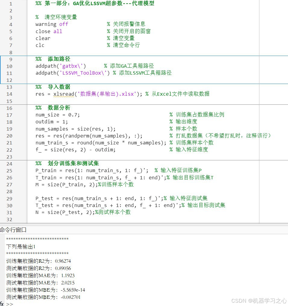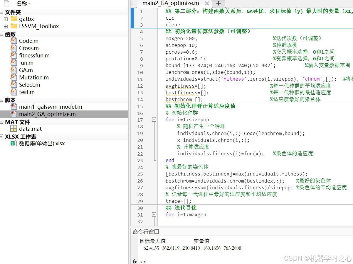 该研究主要围绕 机器学习建模与优化问题 展开。在工程、金融、工业等领域,经常需要建立输入变量与输出目标之间的非线性映射关系,并在此基础上寻找最优输入组合以最大化或最小化目标值。传统建模方法往往难以处理高维、非线性问题,而 遗传算法(GA) 与 最小二乘支持向量机(LSSVM) 的结合能有效解决这类问题。