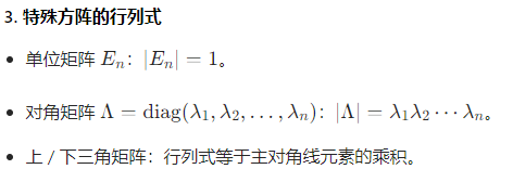 - 乘积行列式:∣AB∣=∣A∣∣B∣(可推广到多个方阵乘积)。