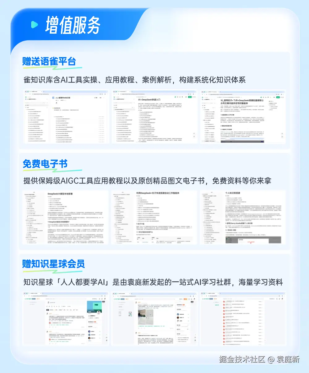 所以,为了改变你我必须得提供"超值增值服务",学习我们课程的同学将享受三大福利:赠语雀知识库、邀请加入知识星球社群、还有就是送海量原创电子教材。