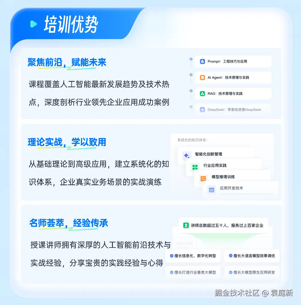 你们的课程培训优势有哪些?那可太多了,核心有三大培训优势。首先就是技术够新,聚焦前沿;然后是,课程内容都是面向行业垂类场景而研发的;最后是咱的老师都是深耕一线的工程师。你就说,这优势给不给力吧。