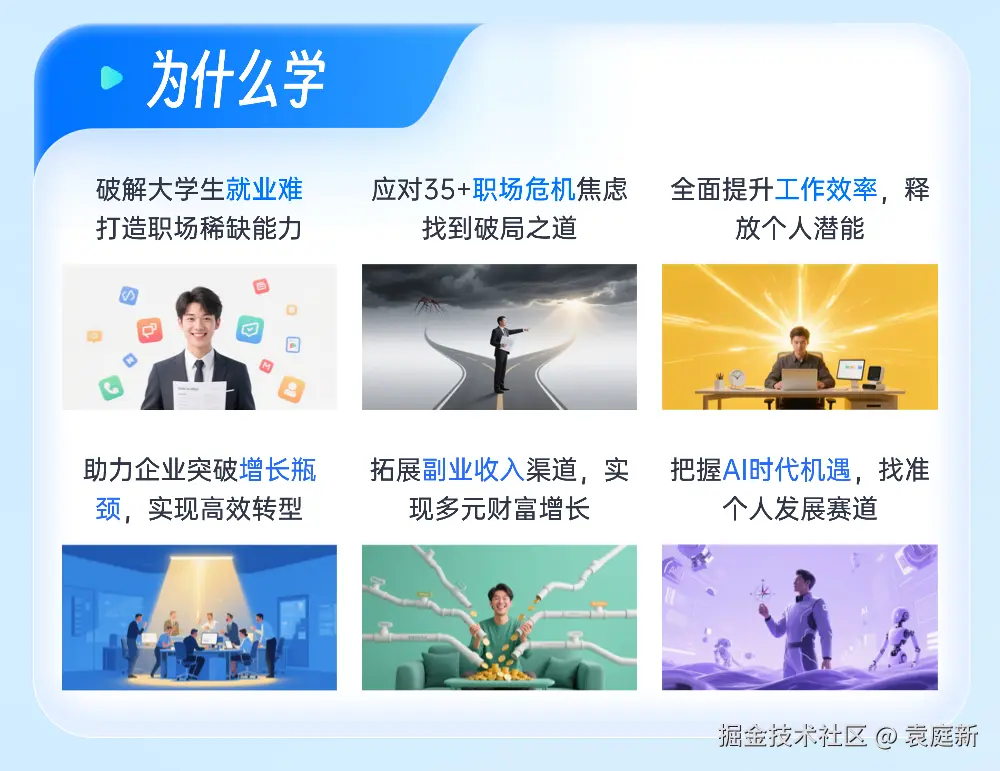 正是身处在这个行业,我才深刻意识到,一项真正具有革命性的技术,正汹涌的渗入这个时代。所以,我才All in做这件事,所以我才如此真诚的在这里分享。为什么要学AI?这里我总结六点: