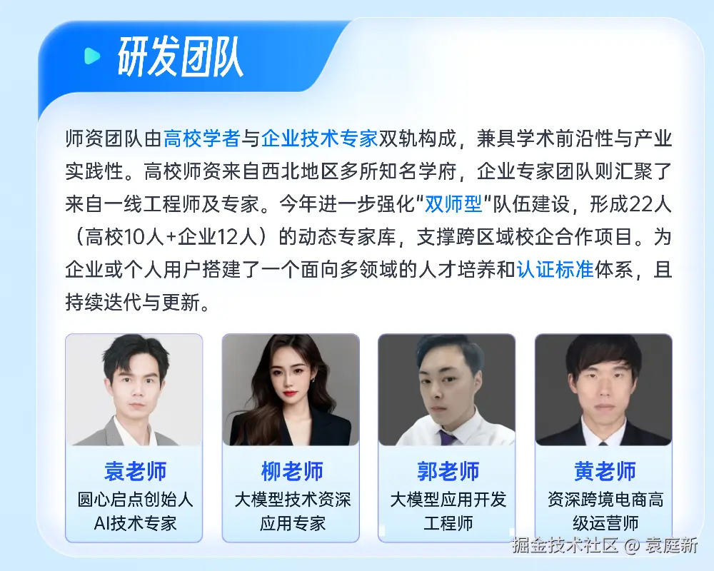 你们的课程核心研发团队资质如何?很强!这不是吹牛。我们的师资团队是由高校学者与企业技术专家双轨构成,兼具学术前沿性与产业实践性。高校师资来自西北地区多所知名学府,企业专家团队则汇聚了来自一线工程师及专家。今年进一步强化"双师型"队伍建设,形成22人(高校10人+企业12人)的动态专家库,支撑跨区域校企合作项目。