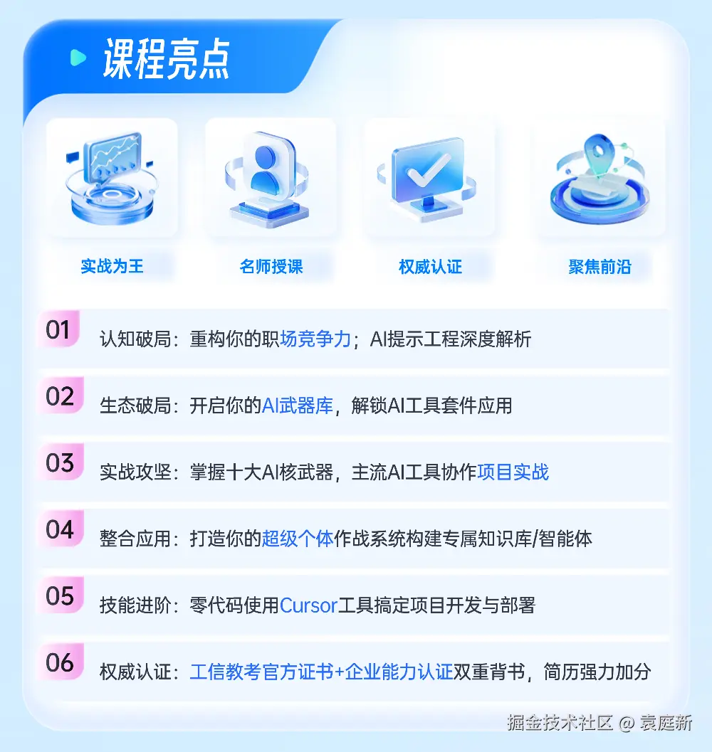 就拿上面这套《人工智能应用全链路职业技能培训课程》来说,有什么课程亮点呢?咱这可是人工智能全职业场景应用实战课程,与行业深度结合,学了就能用,用了就立马见效,就这么神奇!
