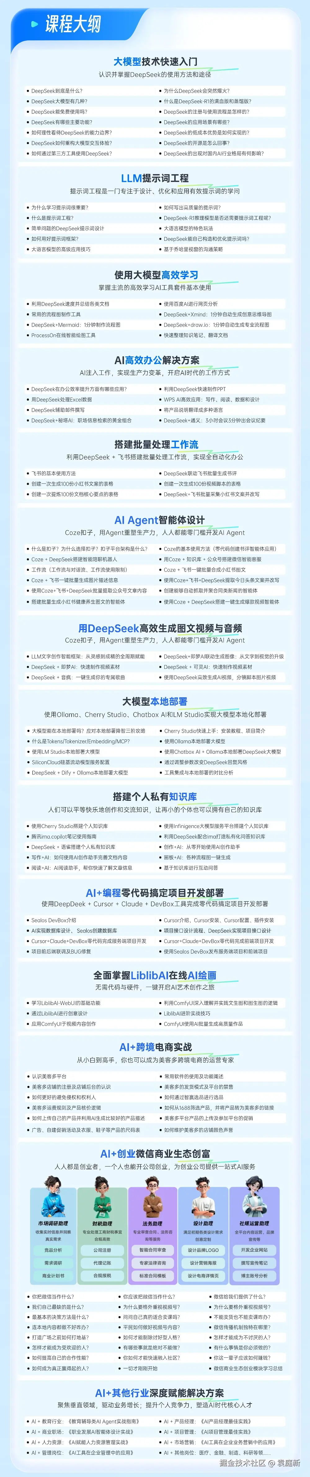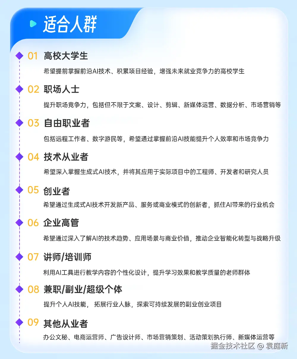 这套课程主要面向包含生成式人工智能相关业务的新媒体、数字人、网络直播、广告设计、电子商务、市场营销、文化旅游、教育、医疗、科研、金融、政务、办公、学习、外贸、制造、创业、程序设计、智能开发等千行百业,开展内容创作、提质增效等业务的企事业单位、从业者和学生。