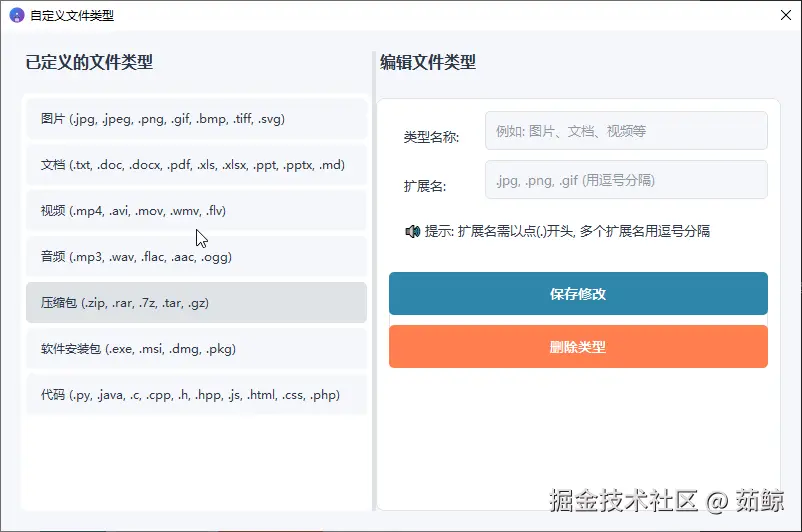 - ✅ 自定义文件类型:支持用户自定义文件类型和分类规则