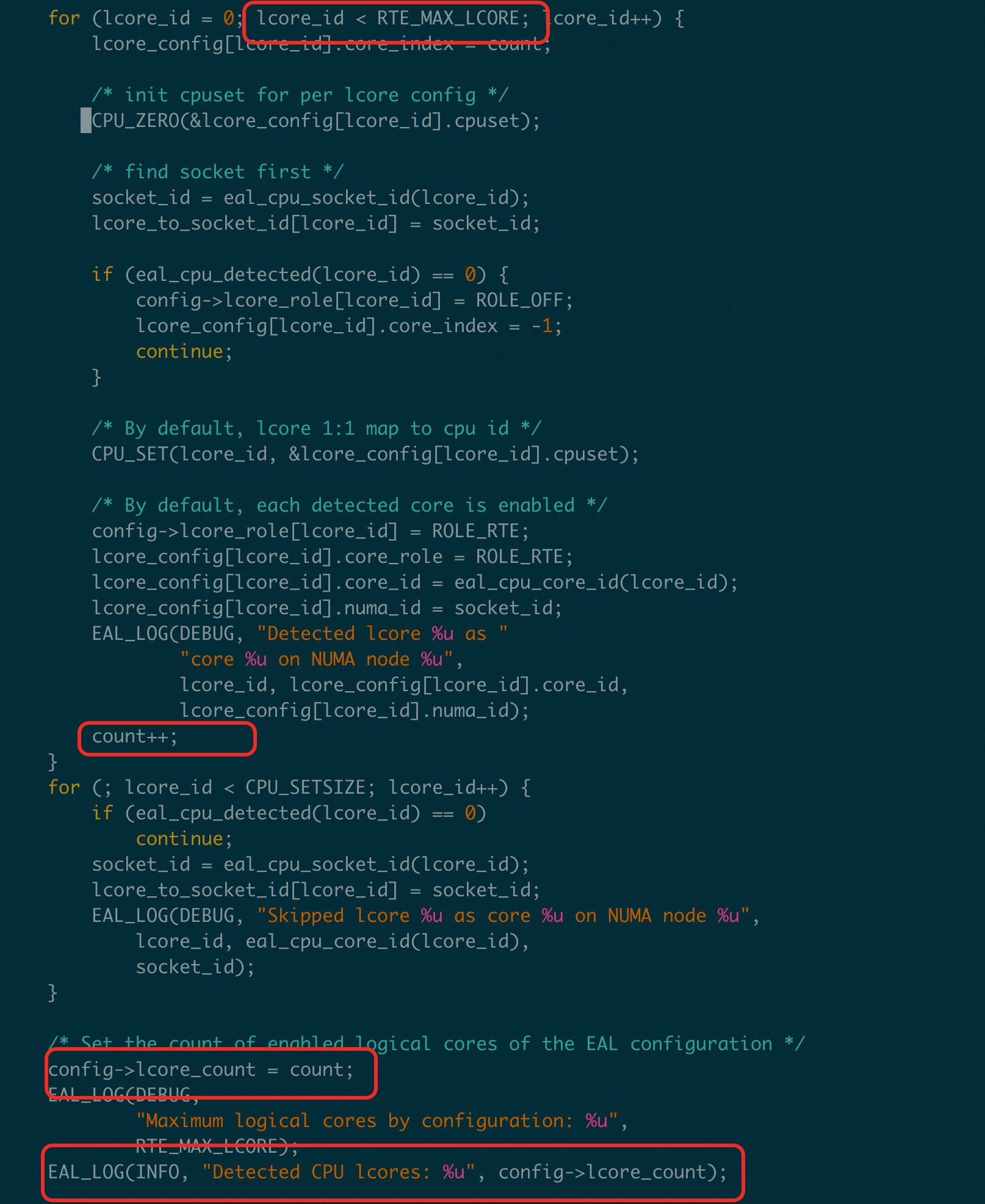 分析代码,可以看到cpu count的上限是由 RTE_MAX_LCORE决定的。而它是由config/x86/meson.build 中的 dpdk_conf.set('RTE_MAX_LCORE', 128) 这个决定。