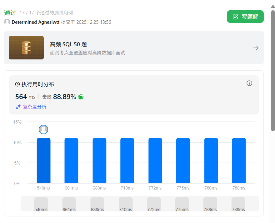 最后输出 followee 以及对应的关注次数即可。需要注意的是,SQL 中一个查询块只能有一个 GROUP BY 子句,因此只保留一次按 followee 分组即可;如果在 SELECT 中把 followee 起别名为 follower,也不意味着要再按 follower 分组,本质仍然是同一个字段。