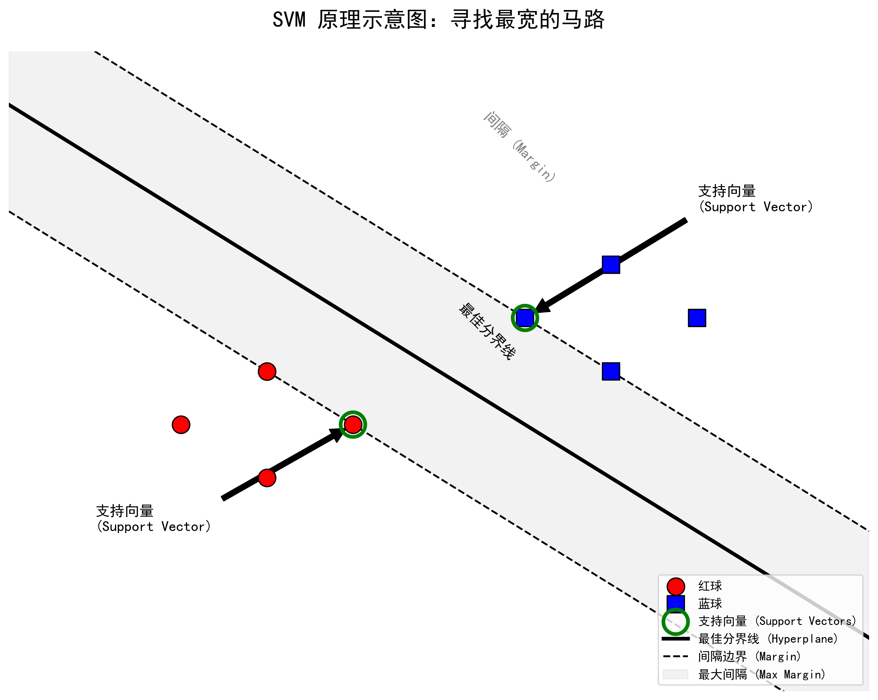 - 支持向量 (Support Vectors) :就是那些离分界线最近的球。它们是"撑起"这条马路宽度的关键角色。其他的球离得远,对分界线的位置没有影响。