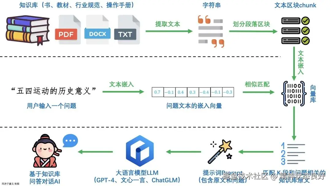 用户提问 → 向量数据库找资料 → LLM 读资料写答案