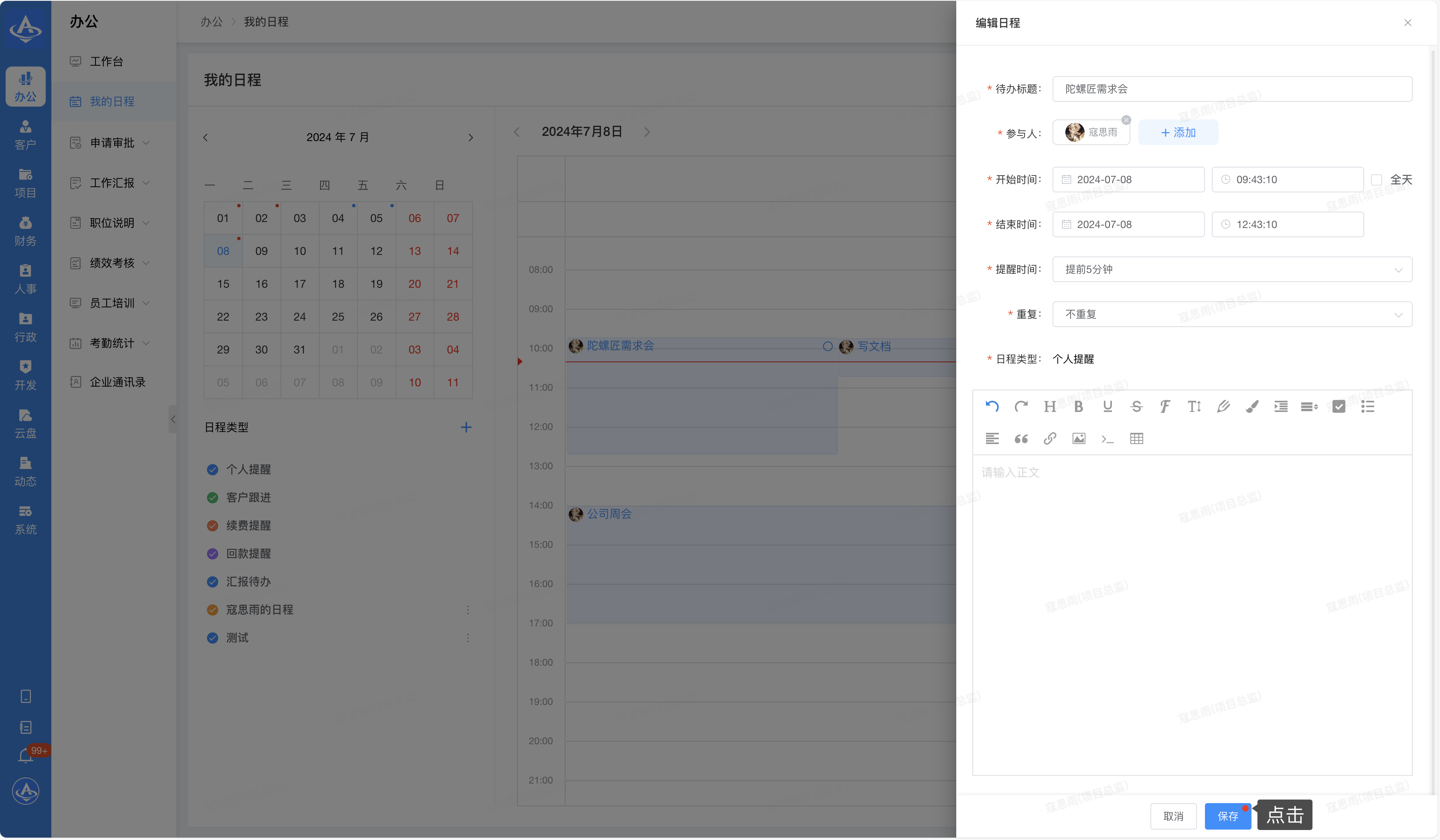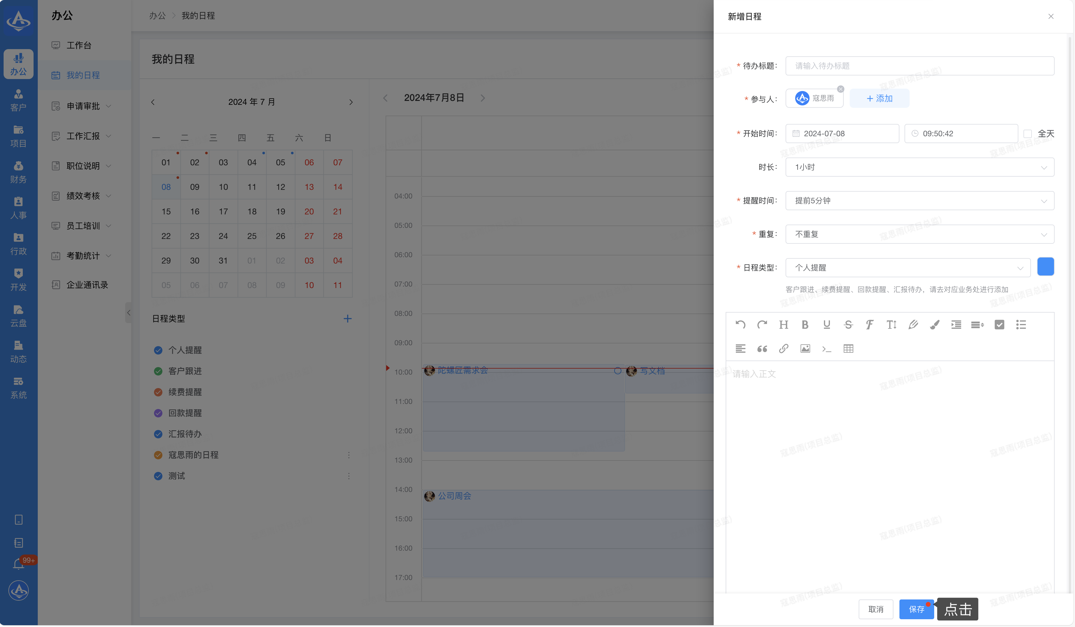 第一步:点击【新建日程】按钮,显示添加任务侧滑;