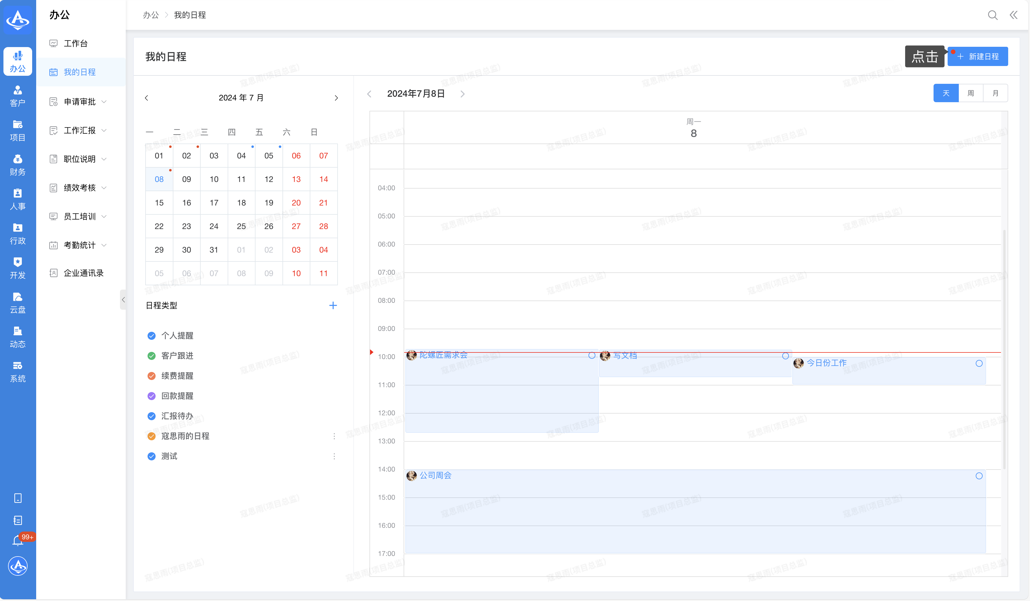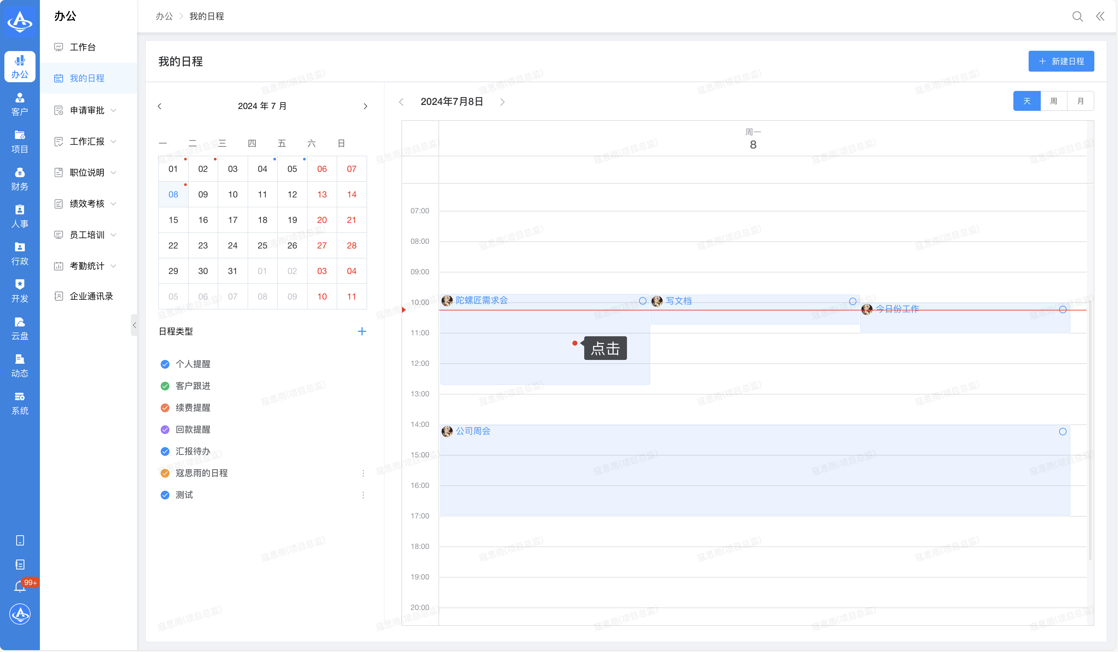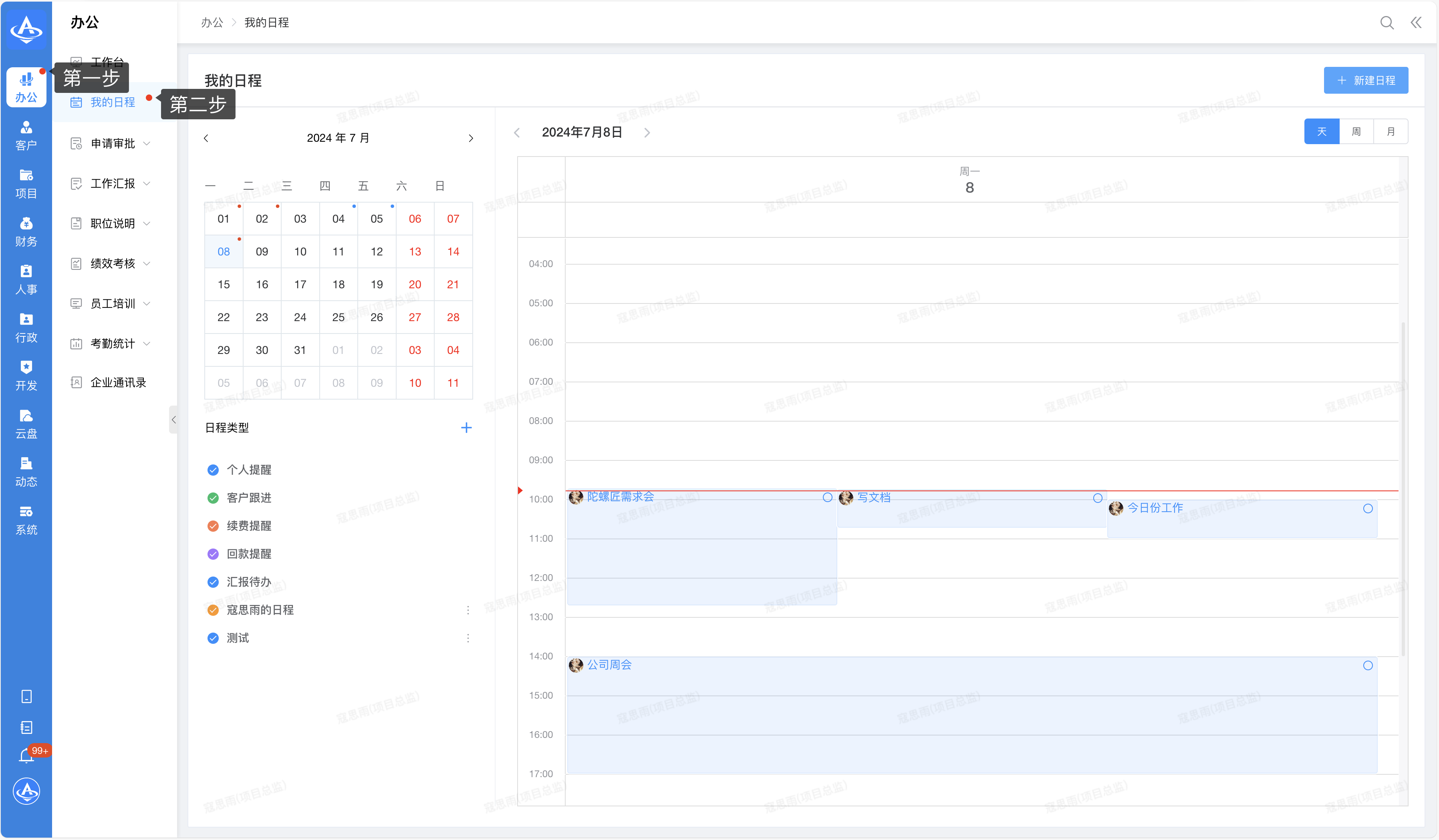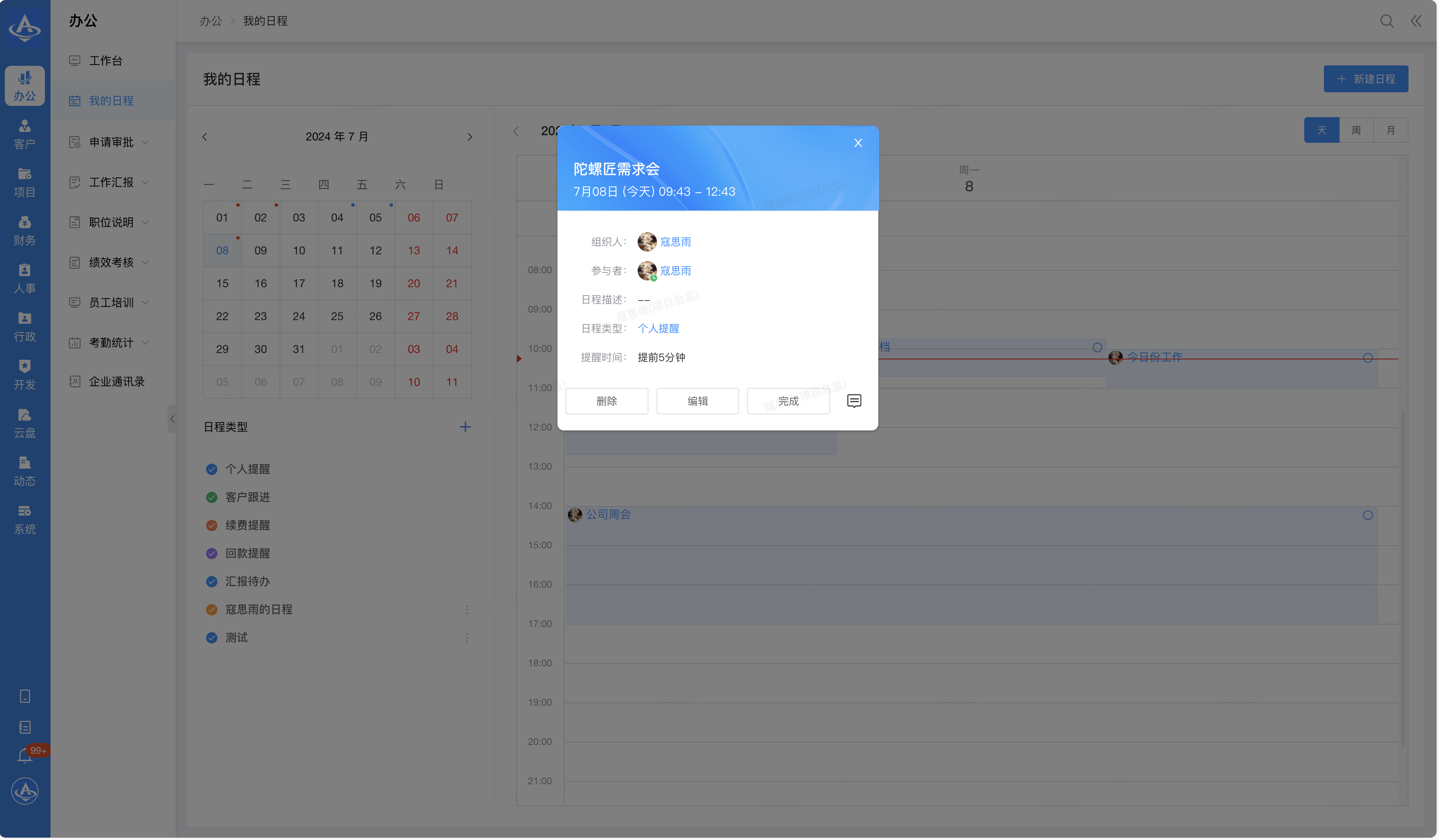 我的日历用于查看、处理与创建某天/某月/某周的待办事项提醒,我的待办可针对某一天的待办日程进行是否完成标记(全部完成为蓝色对号,有待办未完成为红色感叹号标识);待办事项类型包括:个人提醒、客户跟进、续费提醒,其中客户跟进与续费提醒均为客户管理业务相关提醒。