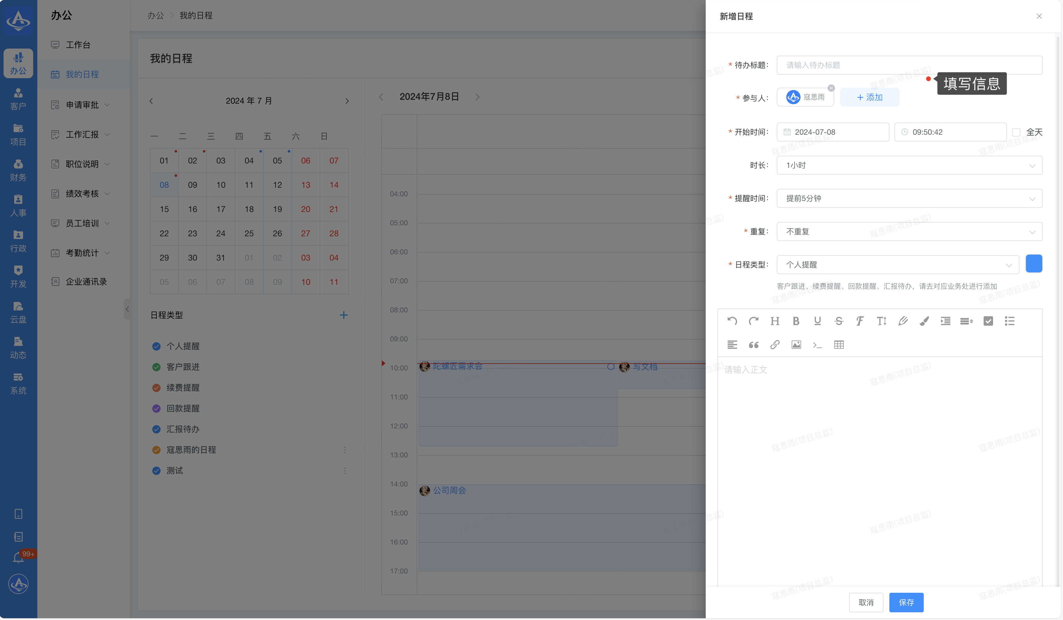 第二步:填写想要添加日程的相关信息,带*为必须填写的内容,不带*则填与不填均可;