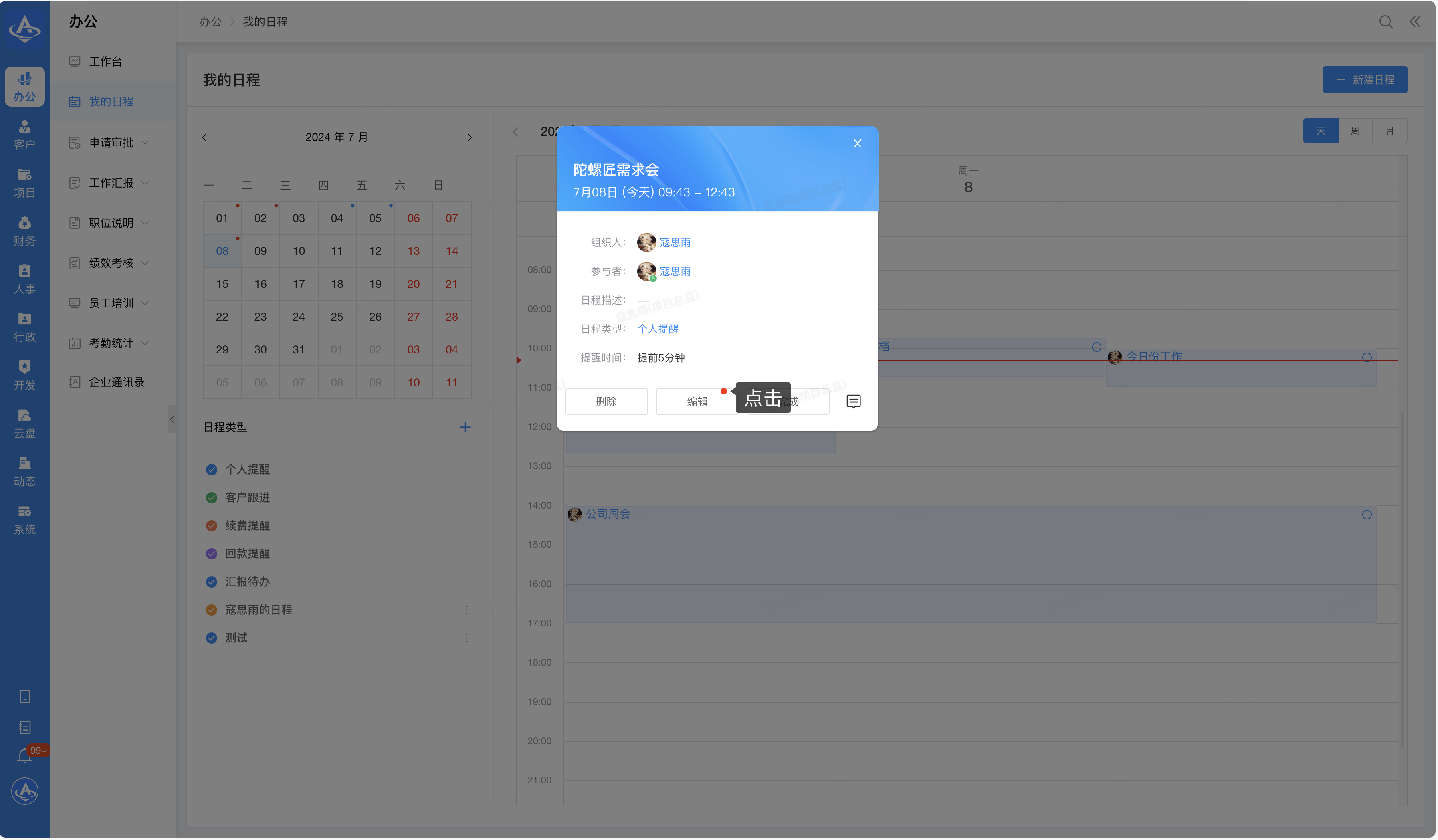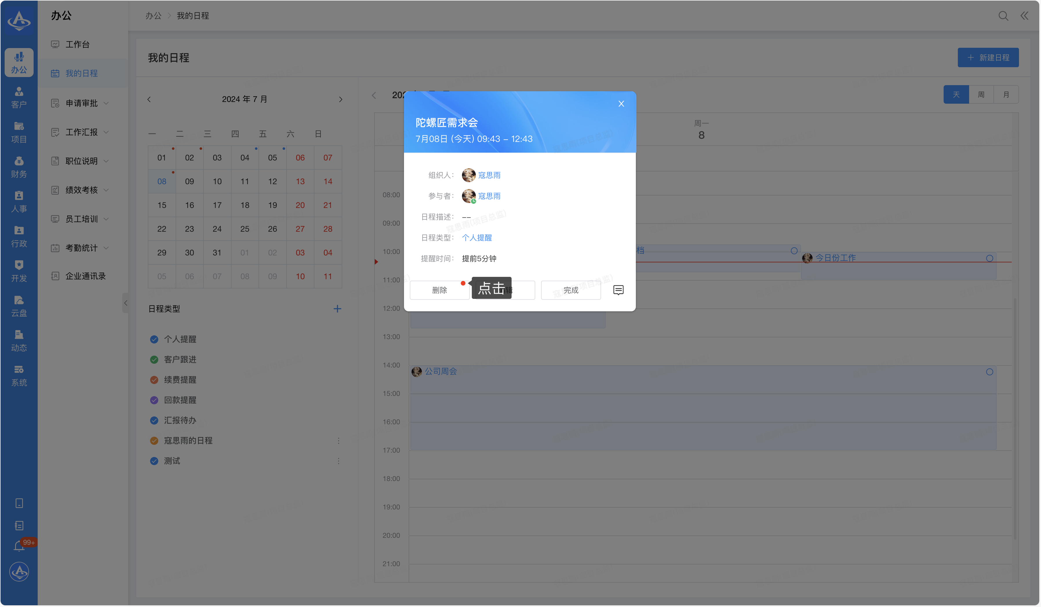 第二步:在日程任务弹窗中,点击【删除】按钮,待办日程删除成功。