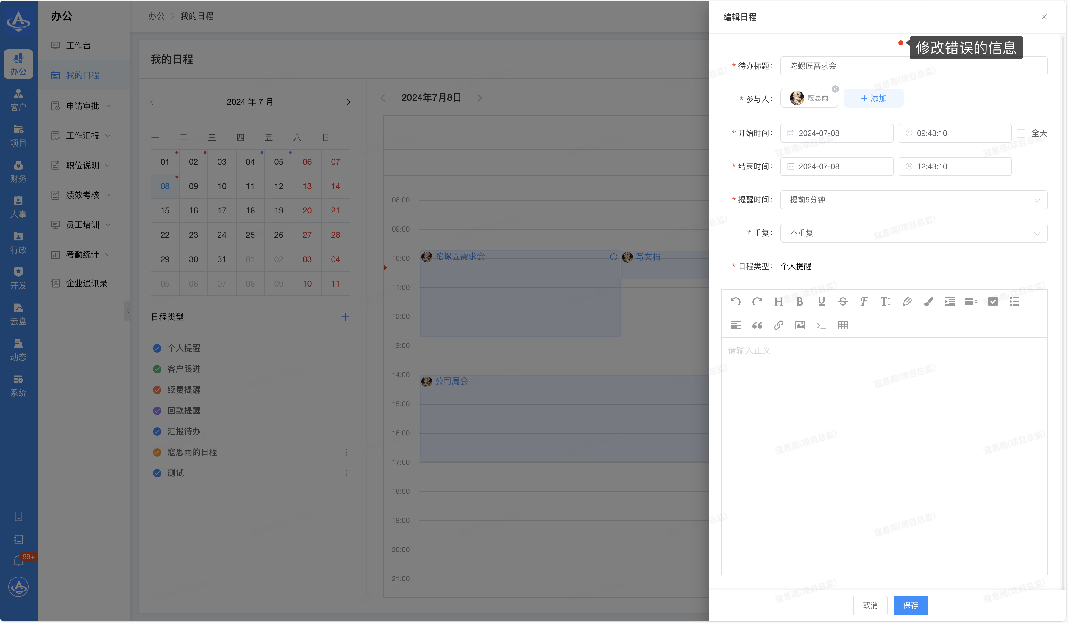 第三步:修改日程的相关信息,带*为必须填写的内容,不带*则填与不填均可;