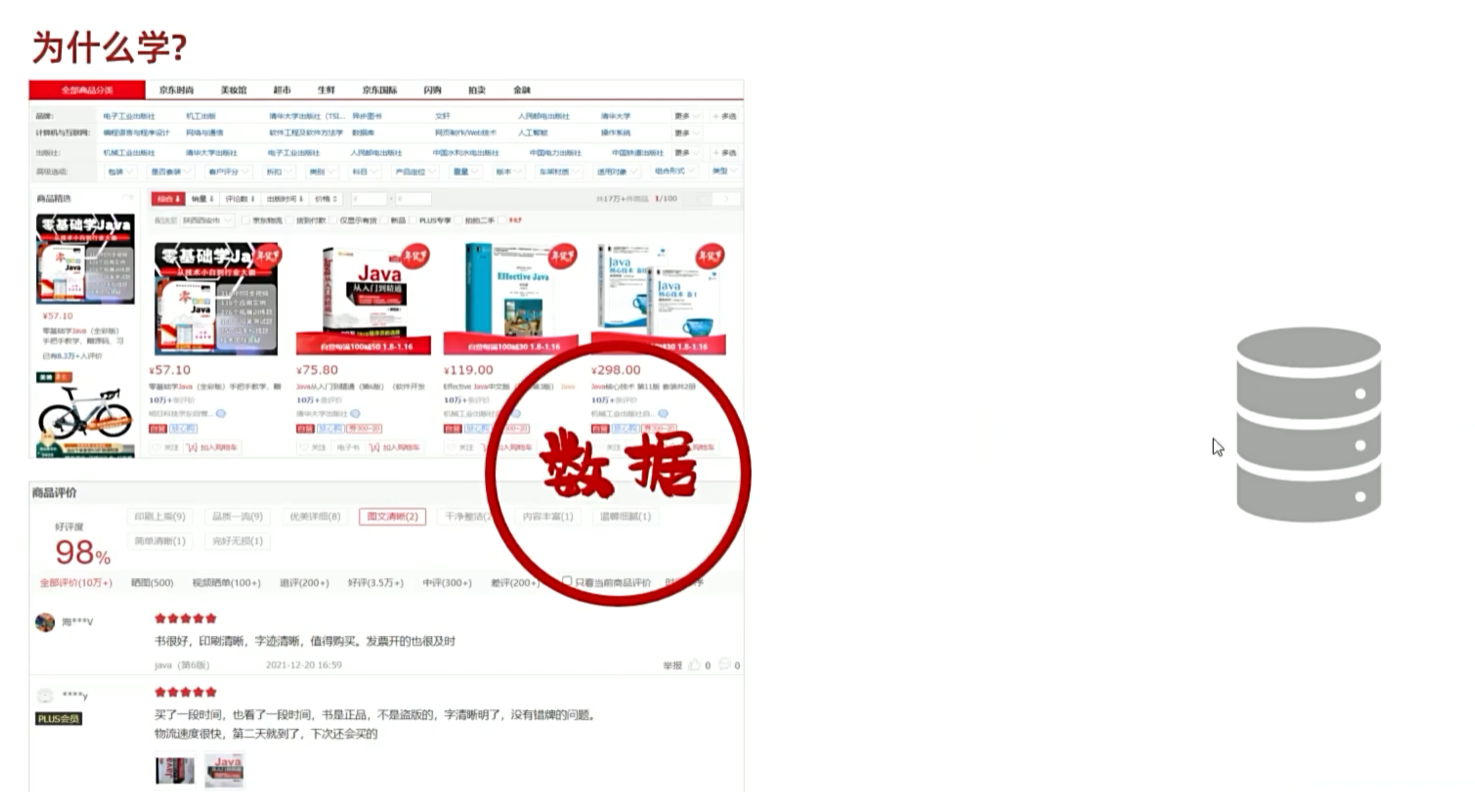 抖音、B站等APP软件的核心是什么,其实是数据。比如我们所看到的购物网站中的商品信息以及评价信息、购物车信息等都是数据,这些数据呢不是在页面中写死的,而是存储在数据库中的。对于这些购物网站来说,只是从数据库中将这些数据取出来,然后再加入对应的业务逻辑就形成这样的电商系统。高效的存储和管理数据才是软件的核心。而我们今天所学的数据库技术就是专门用来存储和管理数据的技术。