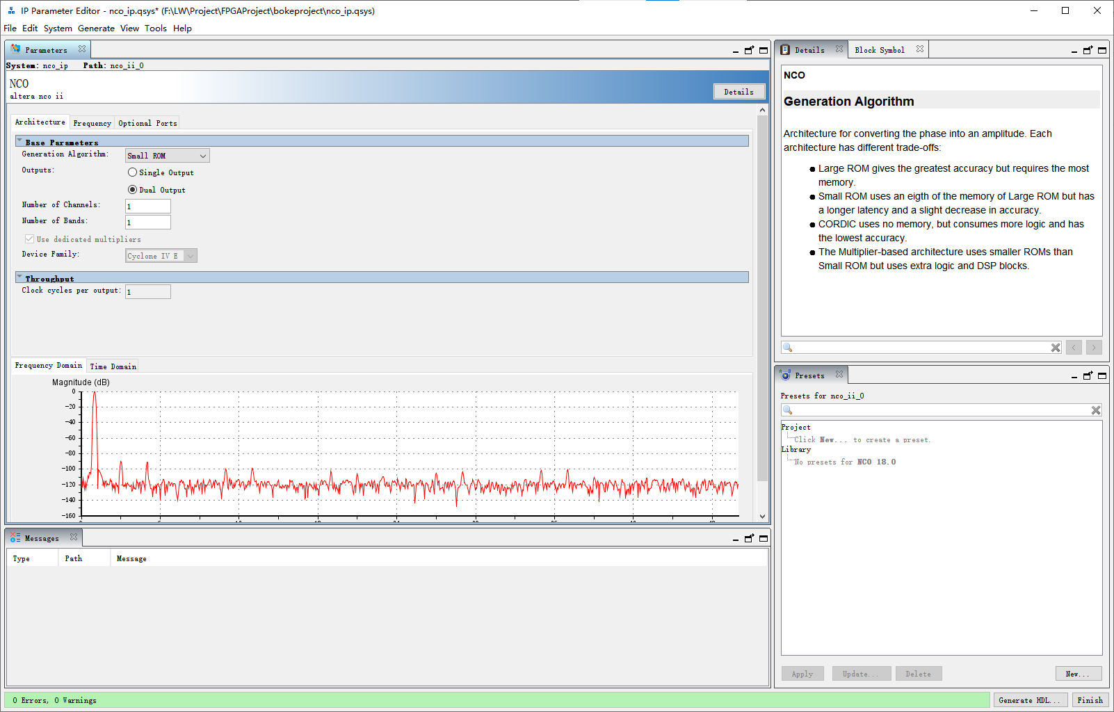 仔细观察可以发现,这个NCO被归类到了DSP的Signal generation中,也就是数字信号处理中的信号生成。双击打开,并输入文件名保存(不展示了)。由于不同人电脑的问题,打开的界面存在显示错位的情况,将窗口全屏就能解决。先看构建(Architecture)这栏。