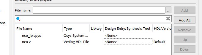 确认无误,记录一下模拟芯片的输入输出引脚,点击右下角的generate HDL...,跳出窗口点击generate,等新窗口都生成完毕,再点击窗口的close后,最后点击finish退出。然后我们要将配置后的文件加入到工程中。右键点击工程,选择settings(设置),点击add all,就能看到nco_ip加入到了工程当中来了。