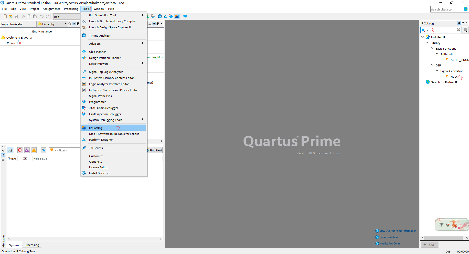 首先,要在菜单栏的工具(Tools)中找到IP Catalog(Alt+7),右侧会跳出IP Catalog窗口,在搜索栏里输入"NCO",找到其中的"ALTPLL",如图(所有的IP核查找过程都是这个)。