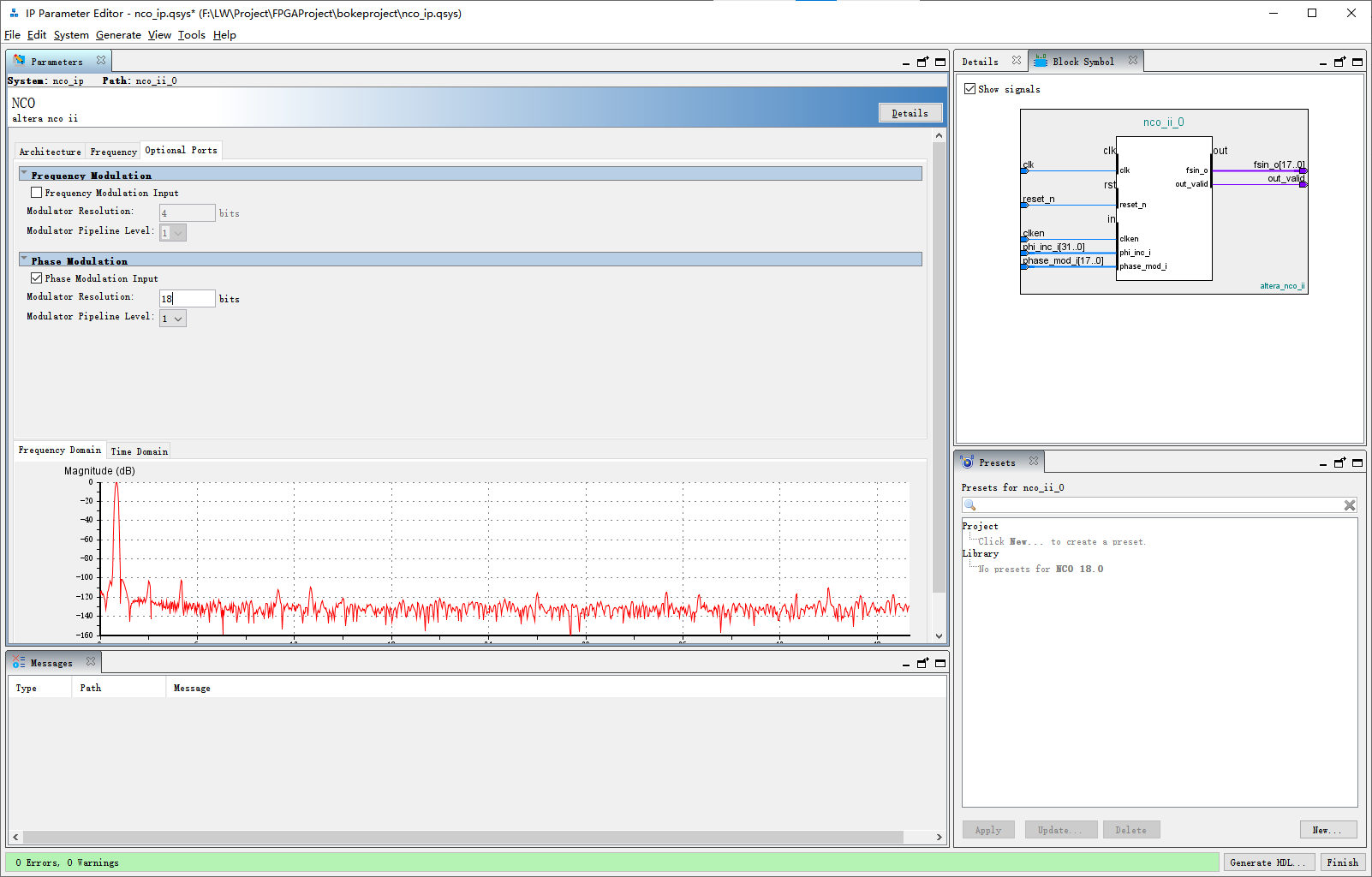 翻到最后一页,optional ports(端口选项)。frequency modulation(频率调制的这个我仍然不清楚具体意义,不勾选);phase modulation(相位调制)这个都勾选并更改里面的位数值直接影响相位变化的精度,这里勾上,方便后续的演示。最后确认一下一个重要的细节:1.频率精度(相位累加精度)32位;2.相位精度(相位调制)18位。