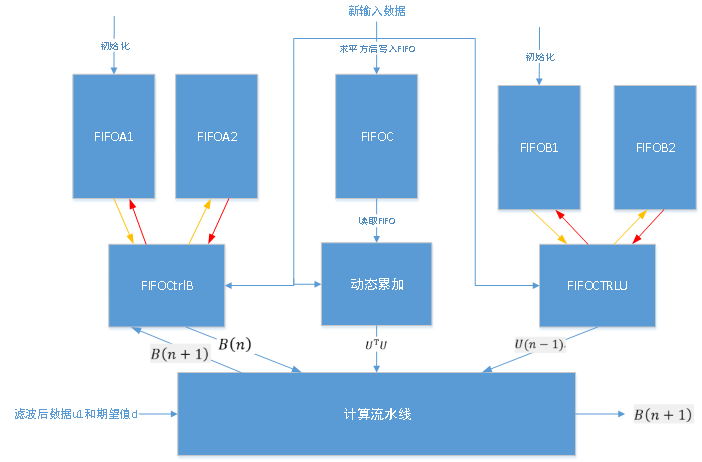 第二步:初始化结束后,等待输入数据(滤波前)u和滤波后数据u1更新,然后FIFOCtrlB模块读FIFOA1的数据并参与计算流水线,动态累加模块读FIFOC以及新输入数据完成累加值更新并参与计算流水线,FIFOCTRLU模块读FIFOB1数据参与计算流水线。
