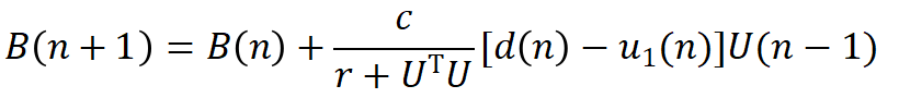 就是需要不断迭代的滤波器系数,M维向量;c和r都是常数;UT表示U的转置也是M维的向量;其他符号在图里面已经比较清楚。这是一种可变更新步长的算法,因为UTU是变化的。