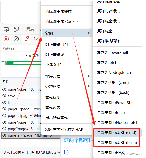 测试接口:在上述步骤后,点击接口右键(这里复制cURL(bash),复制cmd可能无效)