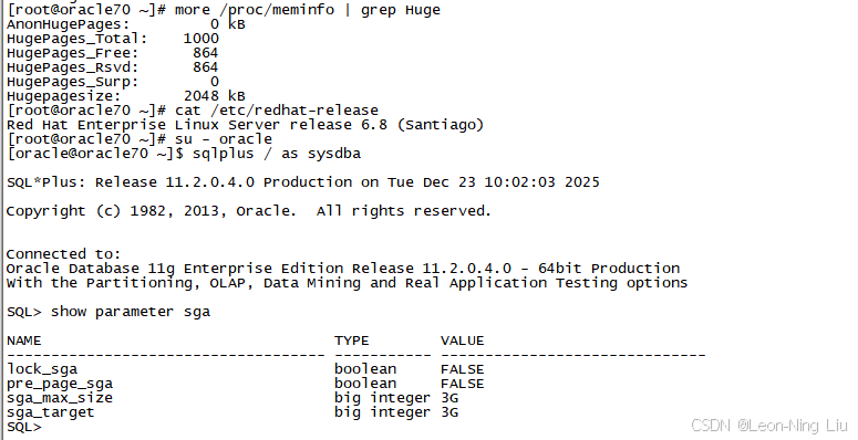 (11.2.0.3) 及更高版本中,Oracle 会先把 SGA 尽可能多地分配到大页里;大页用完后,再用普通页分配剩余部分。这样可能会产生额外的共享内存段,但 SGA 总大小保持不变。在这种"混合页模式"下,数据库会先把可用的大页全部耗尽,然后才切换到普通页。