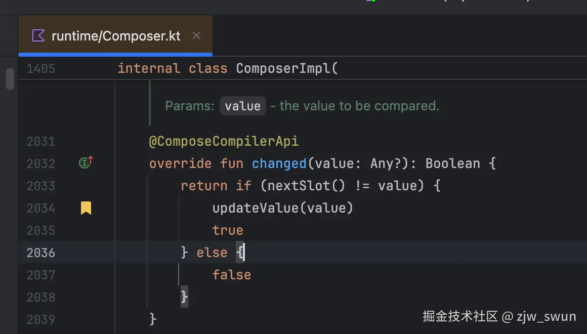 因为SlotTable存储的是整个ComposeView组成composeable函数UI树的所有入参Array,扁平化存储,所以需要以Composeable要是使用Group分组,使用"指针"来锚定当前执行到的composeable函数当前入参,指针寻址这里不做展开说明有兴趣可以自行去看,Composer::changed方法判断本次value和slots存储的对应text是否变化,变化就发生重组逻辑。