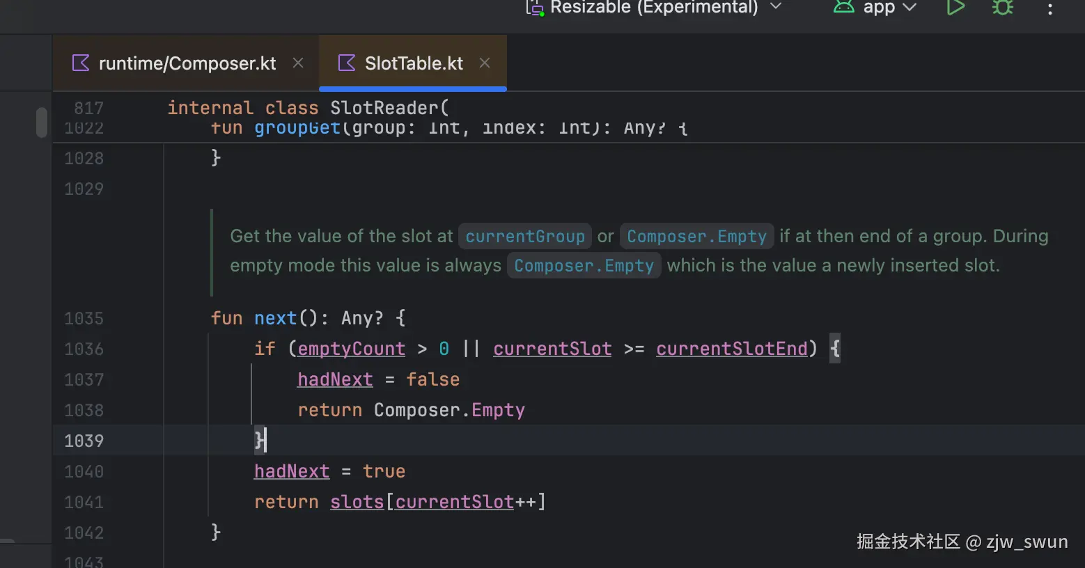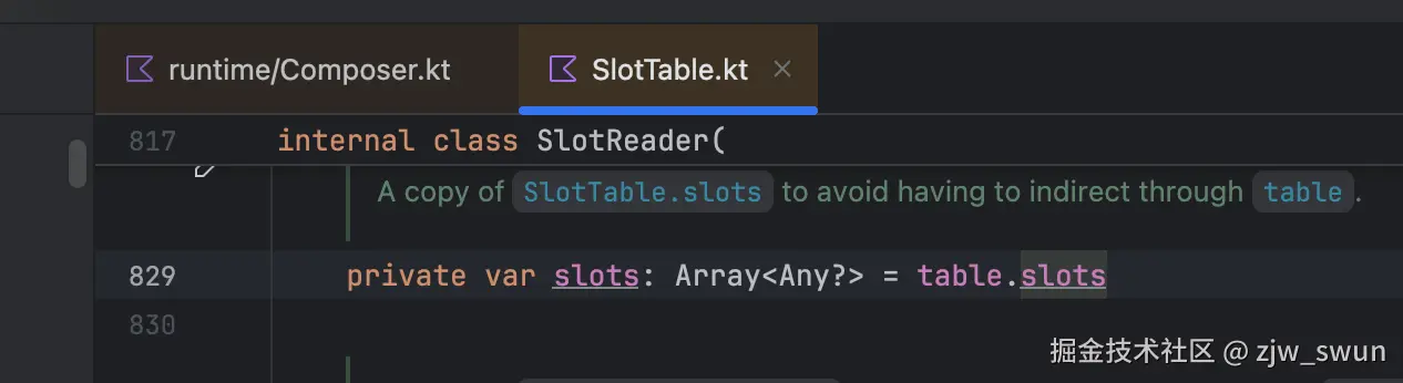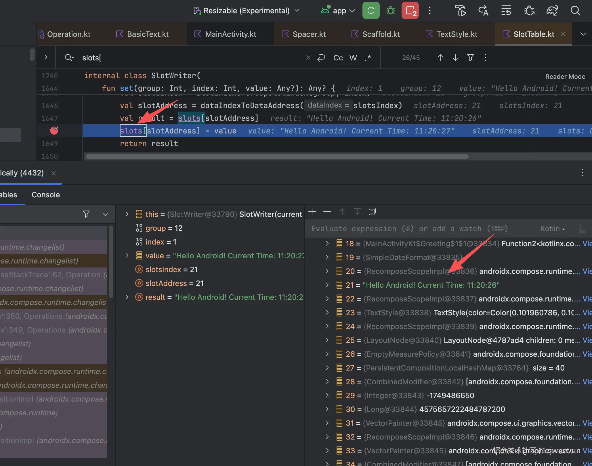 可以看到slots中存储了整个ComposeView中所有入参值是以Array数组的形式,这里就涉及到Composer changed方法为什么要调用nextSlot()和Composerable方法反编译后为什么都有如下3个方法调用