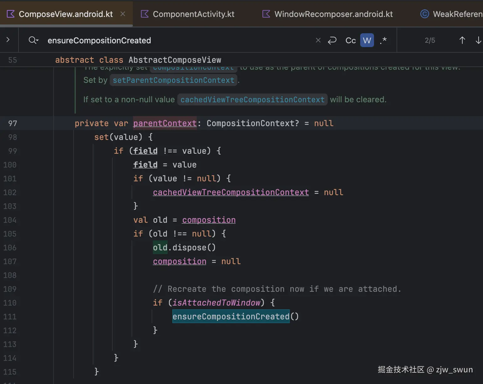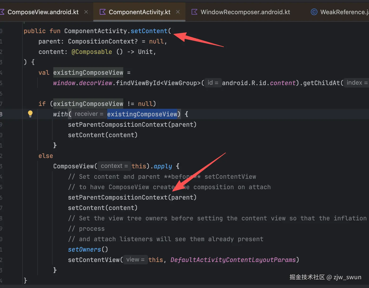 setContentView设置了一个ComposeView 这就是Compose接入到android View系统的桥梁了,同时Compose接入