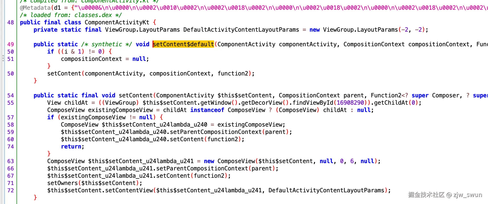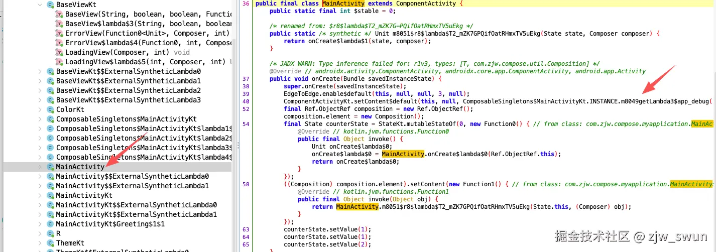 MainActivity 调用setContent的lambda函数 反编译ComposableSingletons <math xmlns="http://www.w3.org/1998/Math/MathML"> M a i n A c t i v i t y K t . I N S T A N C E . m 8049 g e t L a m b d a 3 MainActivityKt.INSTANCE.m8049getLambda3 </math>MainActivityKt.INSTANCE.m8049getLambda3app_debug 对应ComposableSingletons <math xmlns="http://www.w3.org/1998/Math/MathML"> M a i n A c t i v i t y K t 类 81 l a m b d a 3 − > 调用 i n v o k e 方法中的 C o m p o s a b l e S i n g l e t o n s MainActivityKt类 81lambda3 -> 调用invoke方法中的 ComposableSingletons </math>MainActivityKt类81lambda3−>调用invoke方法中的ComposableSingletonsMainActivityKt.INSTANCE.m8048getLambda2$app_debug()对应 f80lambda2调用invoke 不再继续
