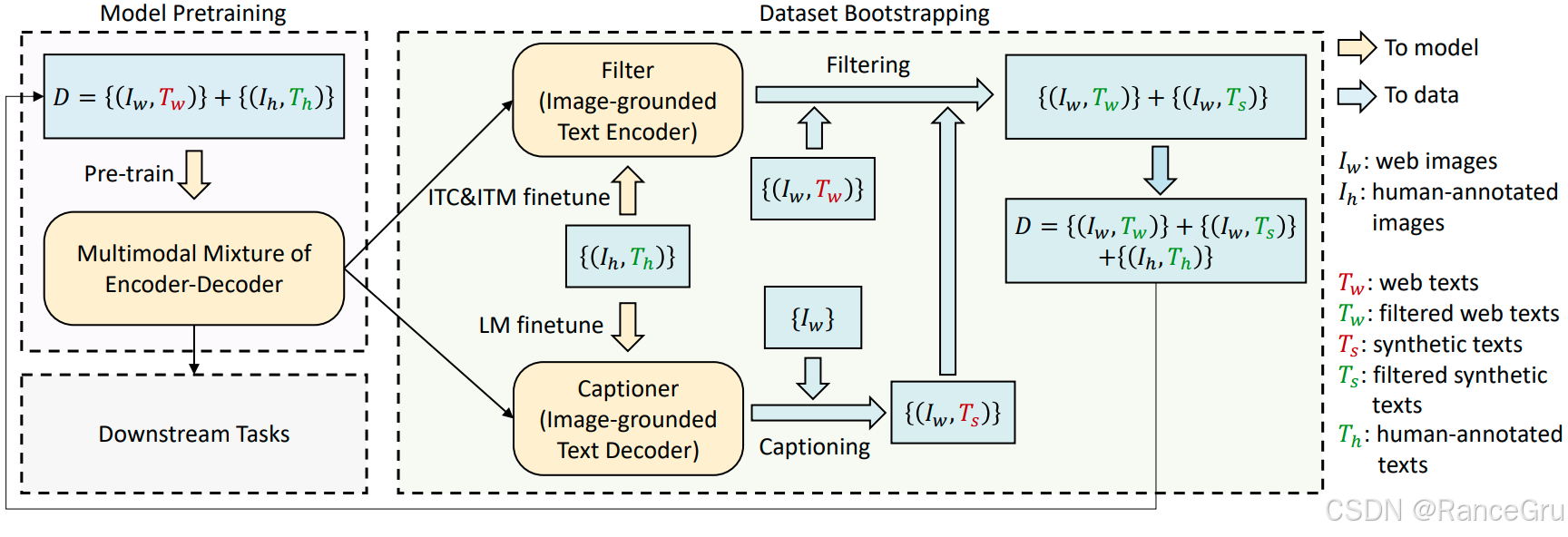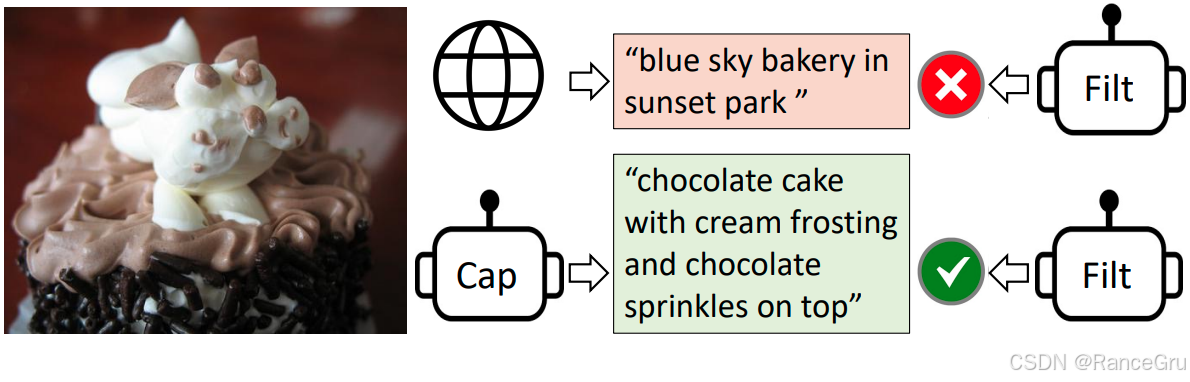 如图,红色表示丢弃,绿色表示采纳,通过ITC+ITM判断生成文本和原有文本哪个更好进行采纳,使得图像 -文本对数据能够更加的匹配,这样的训练数据才更有利于模型的预训练。