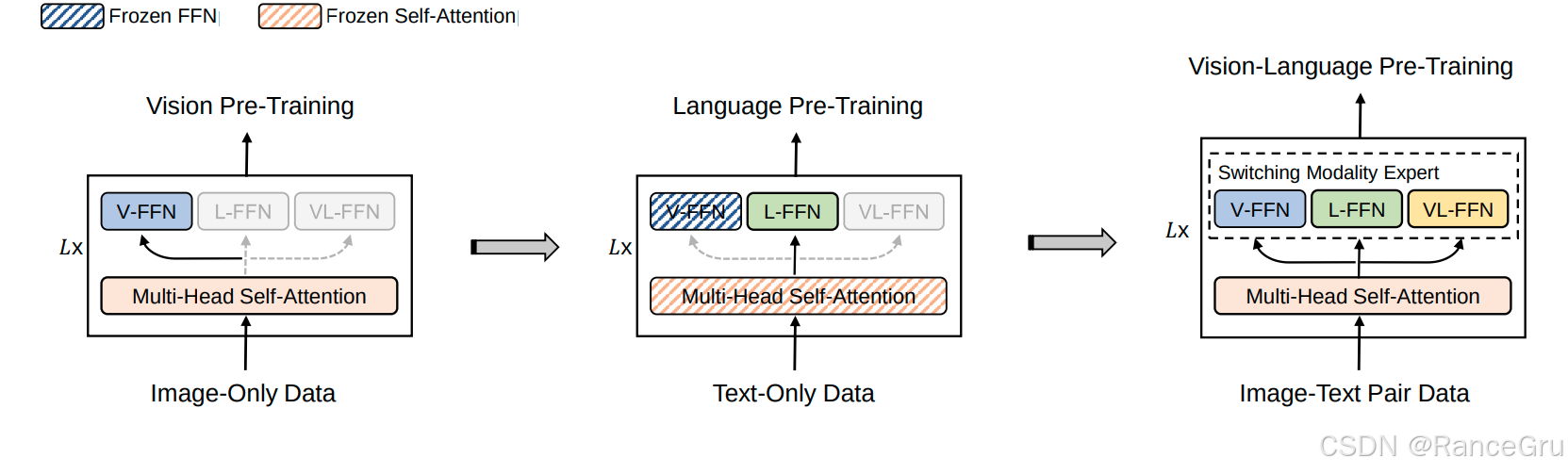 在当时多模态数据标注成本高且相对稀缺,而单模态数据则大量易得,所以在VLMo工作中尝试把单模态数据也应用到模型训练中,单模态和多模态数据集的训练主要是使用的一种分阶段、渐进式、且参数高效的视觉-语言预训练方法。