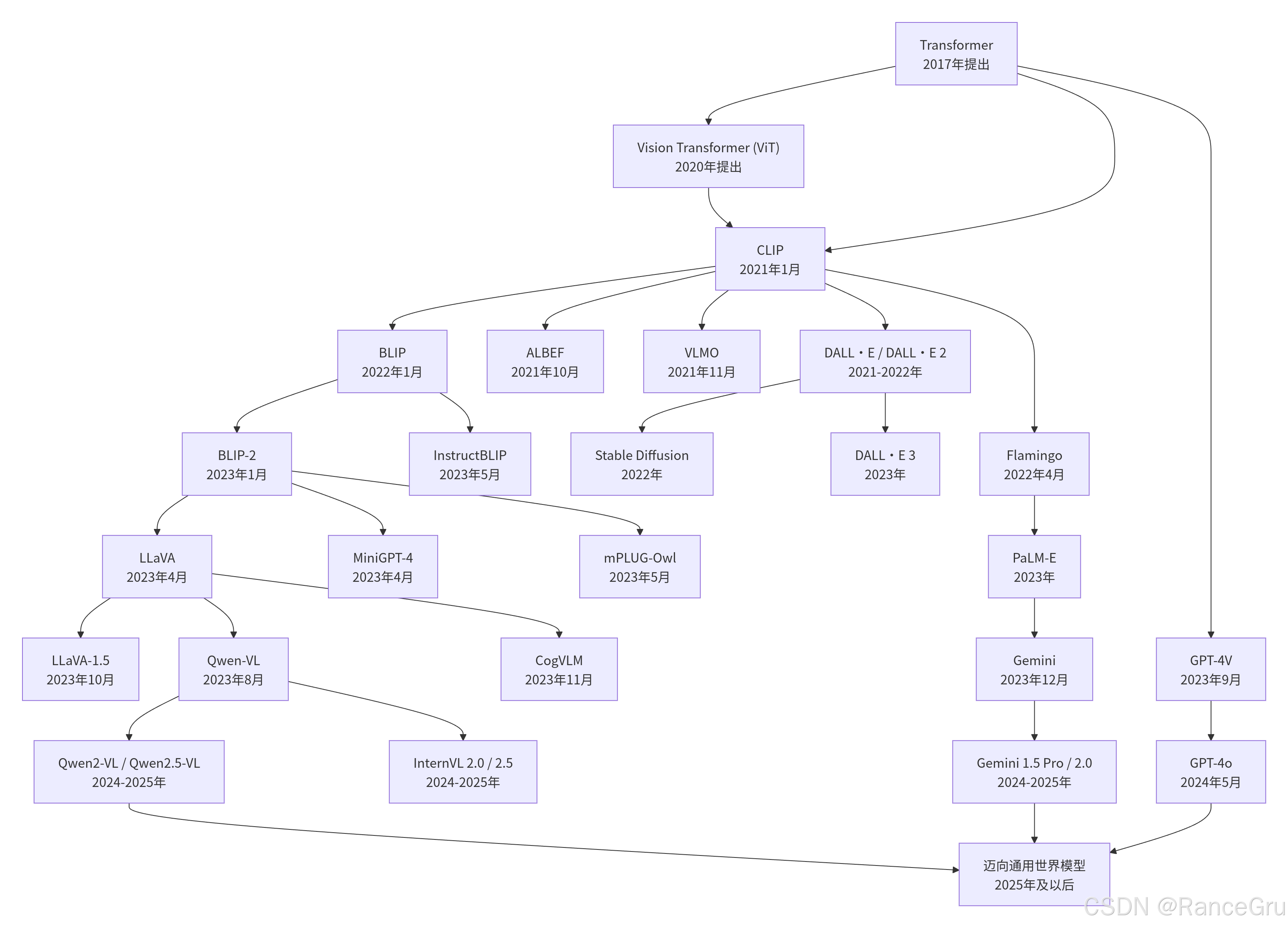 基于Transformer和ViT奠定的统一架构,多模态模型迎来了爆发期。2021年,CLIP通过对比学习联合训练文本和图像编码器,实现了强大的跨模态理解能力;DALL·E则展示了文本生成图像的惊人潜力。此后,模型朝着统一多模态架构、高效轻量化和全模态交互方向快速发展,标志着AI从单一模态感知进入了能够协同理解、生成文本、图像、音频等多模态信息的通用智能新阶段。