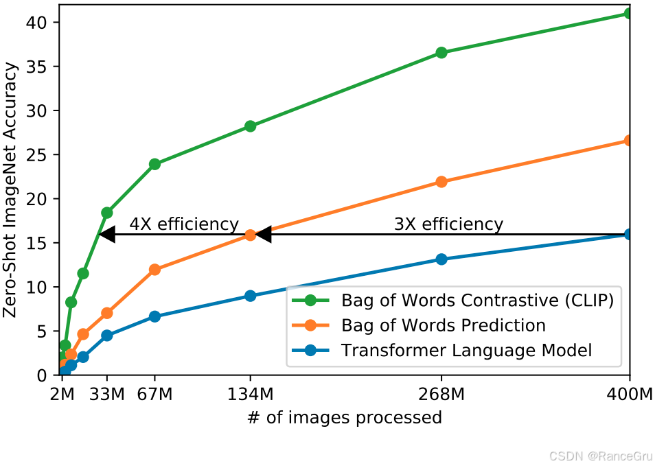 一种基于对比学习的对比模型,直接学习图像和其对应文本描述之间的匹配关系。继续放宽图片-文本的约束条件,不再使用自回归的方式去预测图片的对应文本,只要文本的描述和图片是对应的即可。约束放宽以后训练效率提高了四倍。