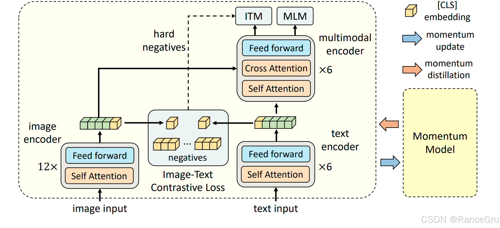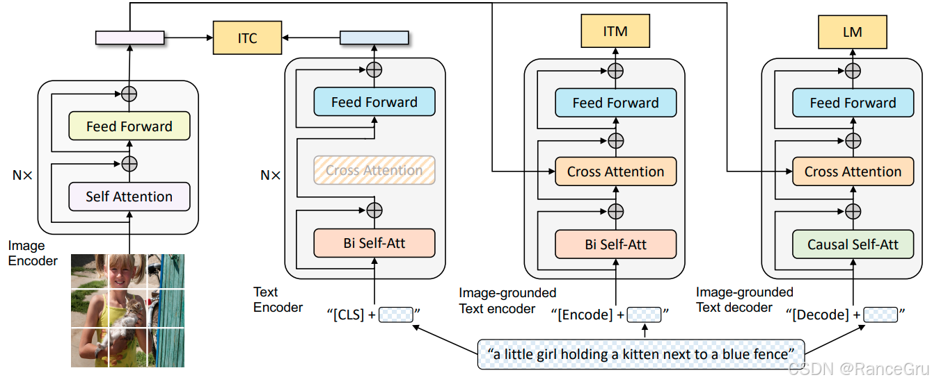 Text Encoder、Image-grounded Text encoder和Image-grounded Text decoder其实是同一个基础模型的三种不同功能模式或变体,颜色一致的模块就是便是属于参数共享,比如Feed Forward、Cross Attention和Bi Self-Att。