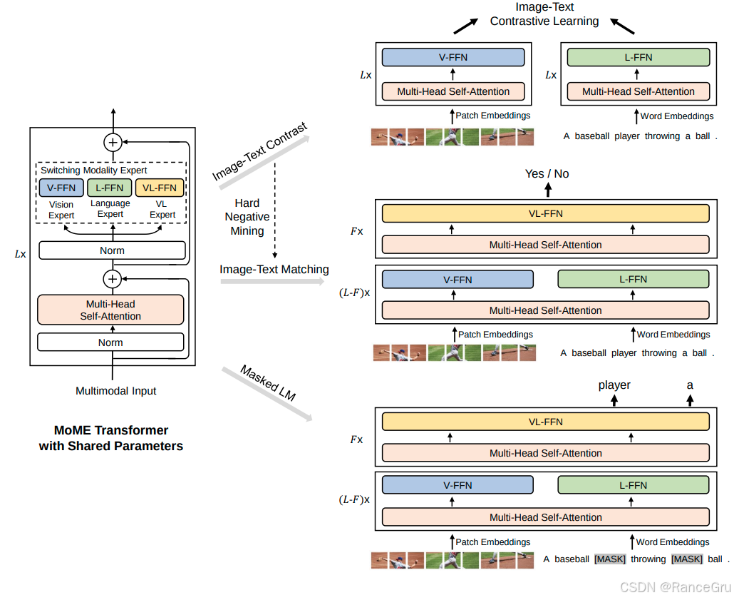 目标:使用图文配对数据进行训练,让模型学会视觉与语言之间的对齐与深度融合。初始化并激活 VL-FFN,将其训练成为处理视觉-语言特征的专家。不再冻结任何模块,并使用ITC、ITM和MLM三个任务进行预训练,在图像-文本对数据上进一步微调,学习跨模态的注意力关系。在推理或训练时,对于图像块输入模型会路由到 V-FFN,对于文本输入模型会路由到 L-FFN,对于图像-文本对输入模型会路由到 VL-FFN。