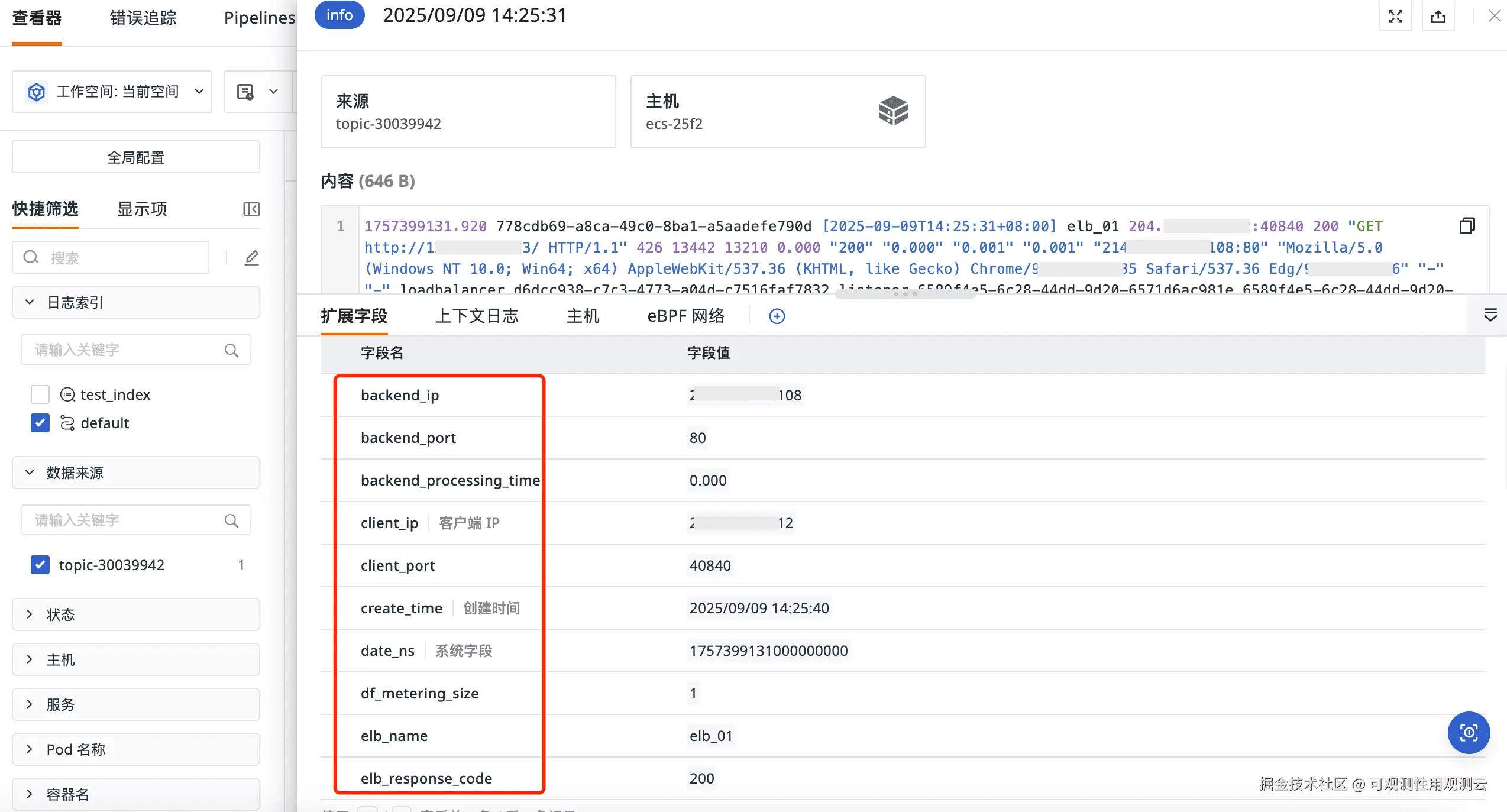 "topic-30039942"="topicSLB.p",topic-30039942 为 Topic 的名字,topicSLB.p为观测云 Pipeline 可编程数据处理器的日志字段提取规则配置。涉及的业务日志和 topicSLB.p 的内容详细见下面的《使用 Pipeline》。