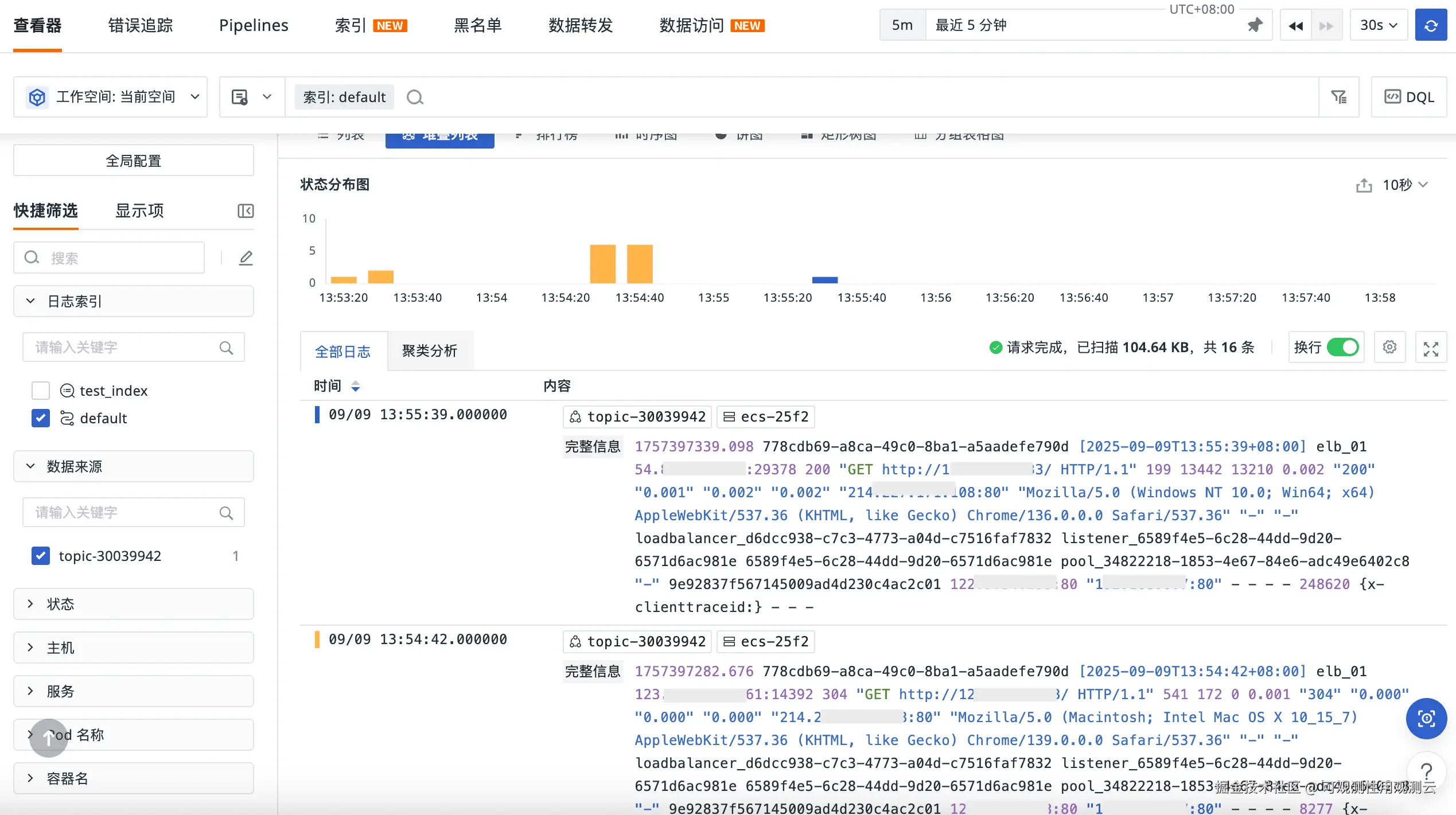 1、登录观测云控制台 → 日志查看器 ,可以看到相关日志已经被采集到了观测云。