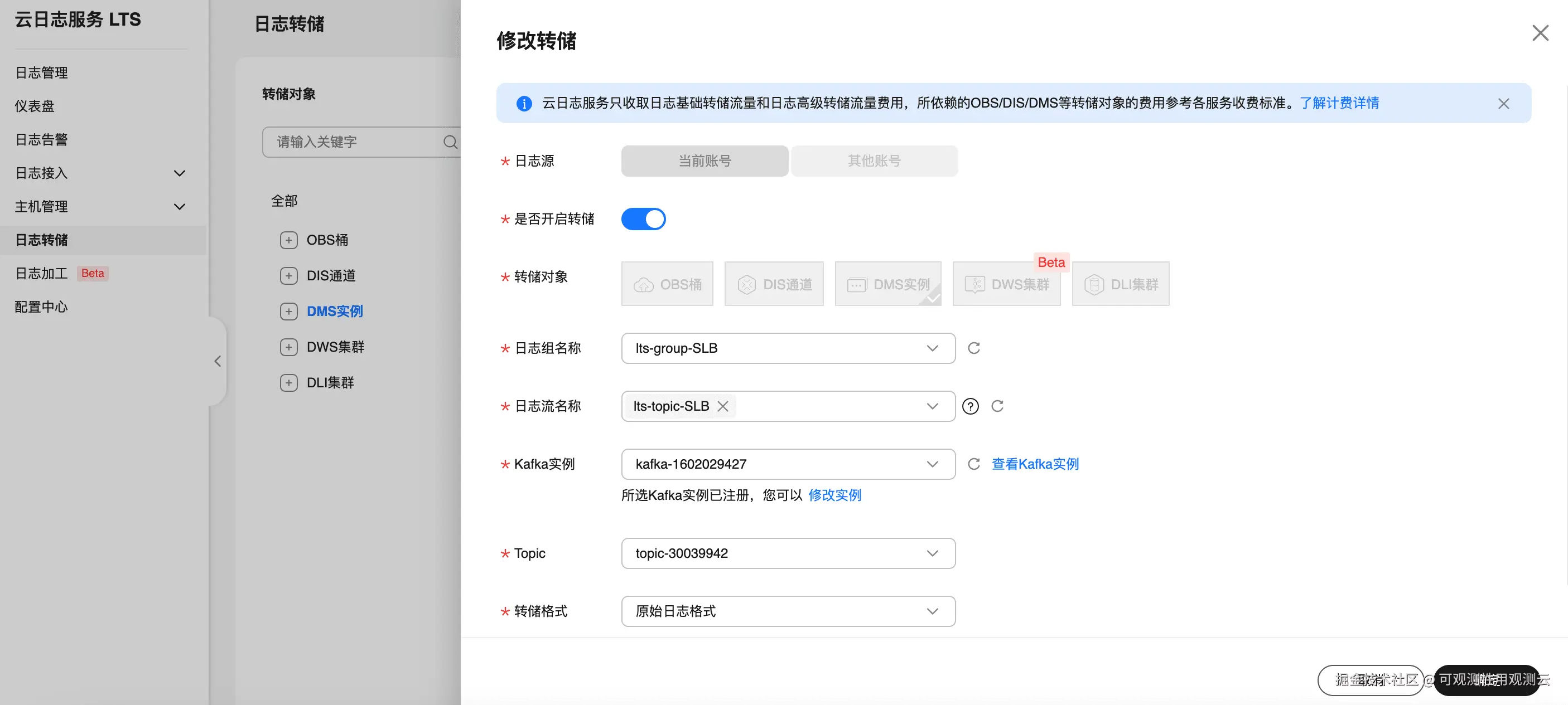 3、配置转储目标:选择 DMS 作为转储对象,并设置实施转储,设置要转储的日志组和日志流名称,以及 DMS 实例和 topic。