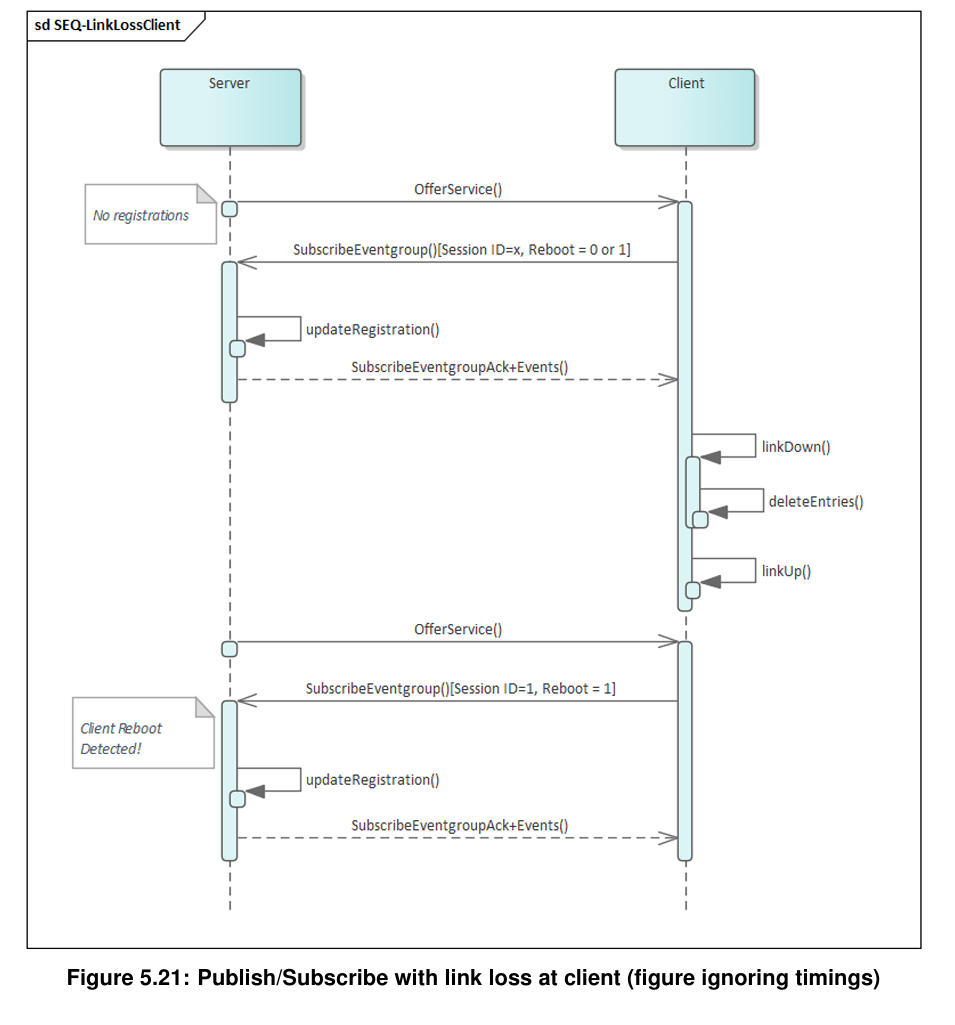 客户端只要还在意"events",""notification events ,就应该在每次收到服务端的Offer Service Entry时使用Subscribe Eventgroup Entry回应。当客户端可以通过消息中的reboot flag确信服务端已经重启了,客户端需要进行与收到"StopOffer Entry"时一样的处理。