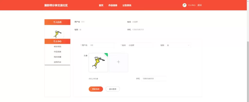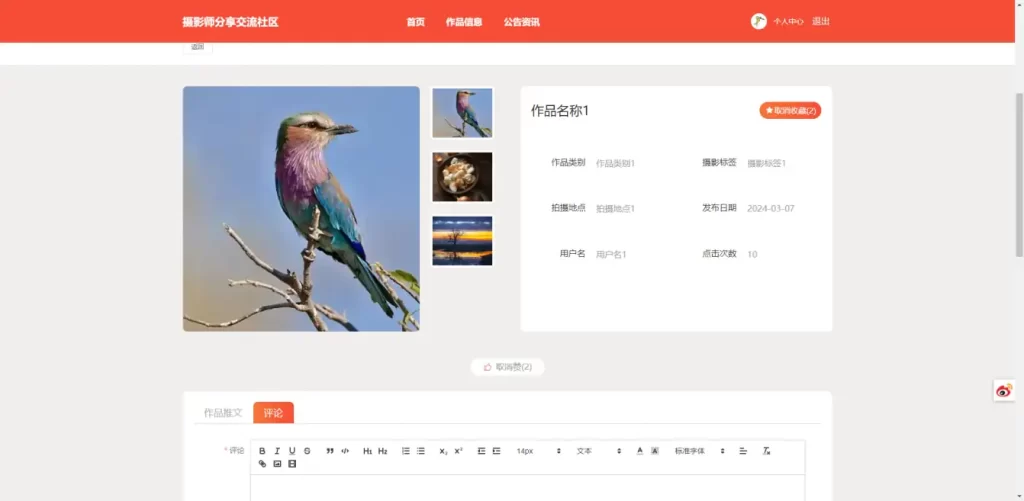 - 上传个人摄影作品,填写作品名称、拍摄地点、摄影标签、所属类别等信息