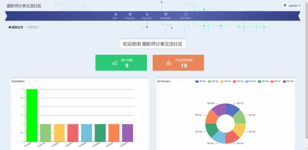 - 系统首页:查看用户数量、作品总数、待审内容等关键运营指标