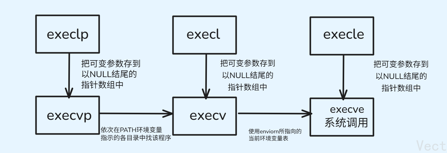 l(list):参数采用列表v(vector):参数用数组p(path):有p则自动搜索环境变量PATH,不用带详细路径e(env):表示自己维护环境变量