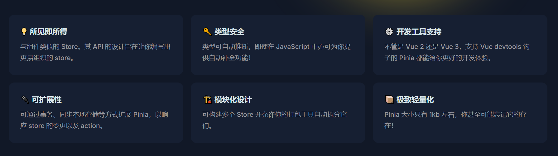 Pinia 是 Vue3 官方推荐的状态管理库(替代 Vuex),相比 Vuex 更简洁、轻量化,原生支持组合式 API,无嵌套模块限制,且完美兼容 Vue DevTools。下面时pinia官方的介绍: